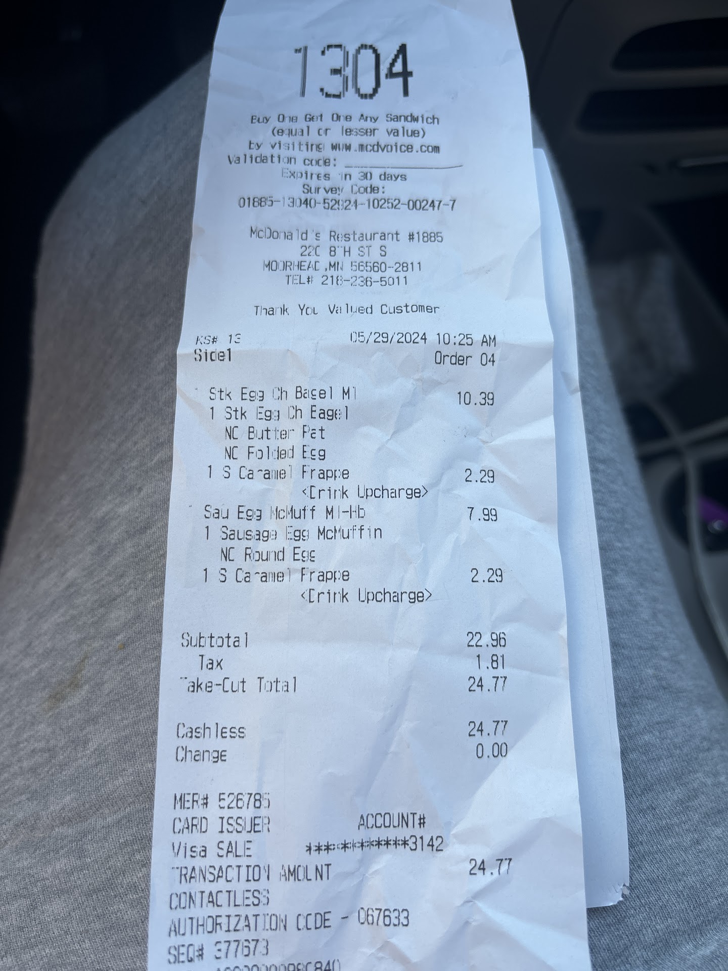 Again, greeted very pleasantly by the crew member at the second window, but was informed that as their drive-thru order had gone into disarray due to drivers cutting in line, they had thought I was no longer in line, and had given my food away. This was a little strange, as I hadn't waited very long, but I very much understand that things can go missing during busy hours, so it was no real issue to me. The crew member asked for my receipt and for me to pull ahead, and they would get to work on remaking my order.