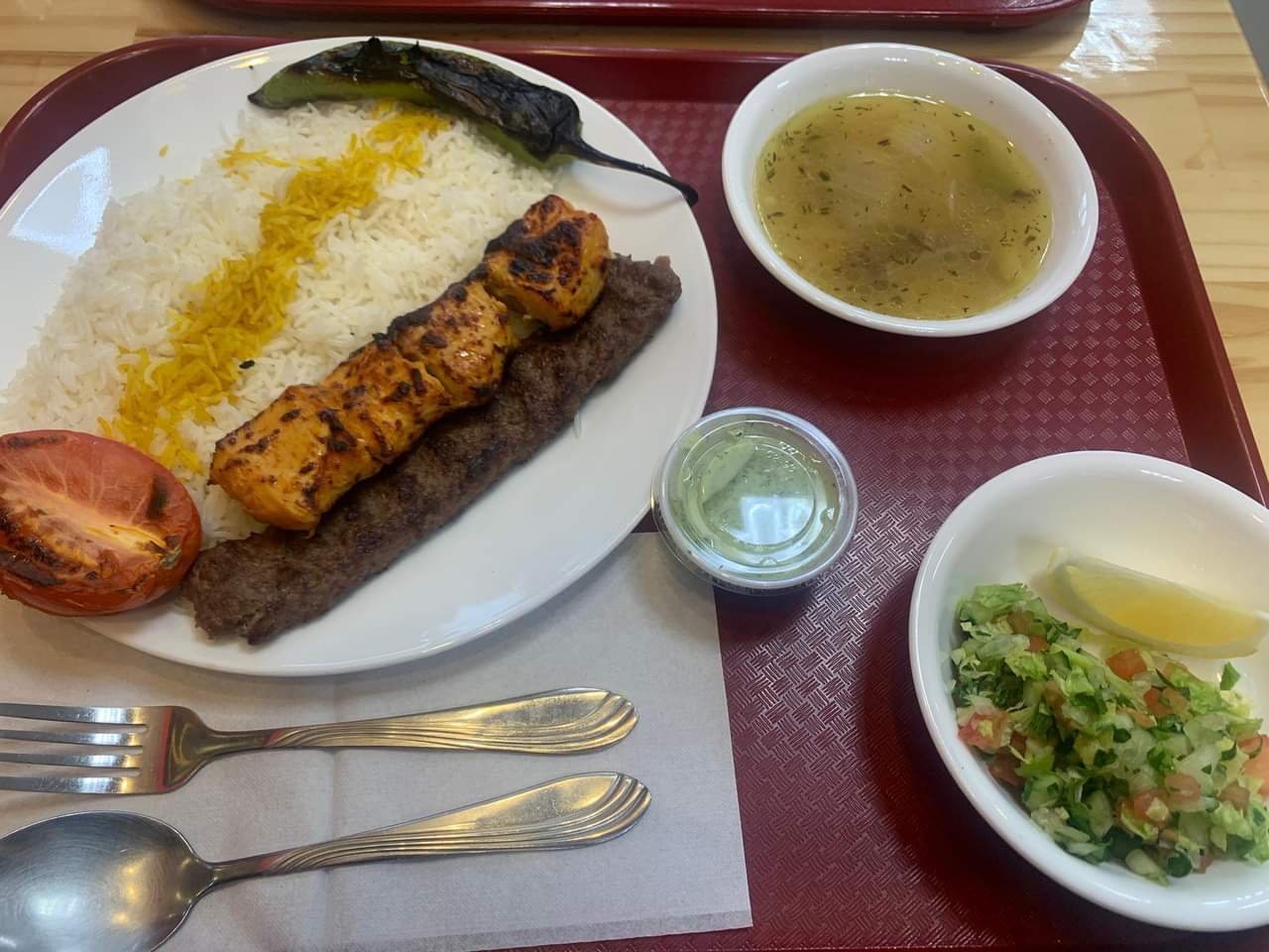 Read moreWe were looking for some local places to eat lunch and came across this one on Google. We like that type of food in general so we were up for it. We had to wait for our food, but it was not a big deal. Everything came out fresh and hot! We had different platters including chicken and beef. These came with chicken soup, pretty good one! It's not your typical chicken soup from the can so it takes way better! Plates came with the side sauce which was the highlight of the meal for me! So yummy! Seriously, the best tasting sauce I have every tried! The rice was AMAZING! I don't think I ever said it about the rice before. It tasted so good! We also got pita bread with hummus but I personally didn't care for spices over hummus. Olive oil over was a nice touch. And employees there are the best! So nice, welcoming, and kind! They explained the difference between different types of food we were thinking to order. Such a nice family! Thank you! We highly recommend...