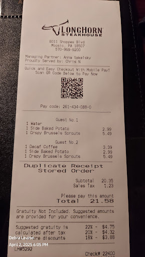 Read moreToday we came in for the first time ever. 4 adults and 3 kids. We were seated quickly even with the restrictions of placement for COVID. Our server Jessica was friendly and mostly helpful but walked away quickly while some of us were still talking to her..ok..that's fine. We ordered 2 margaritas, a strawberry 1 and a mango 1. When we got them...the entire bottom of the drink was salt...the same salt around the rim but I'm talking like and entire sugar packet worth. So our first sips from the straw were basically nothing but salt 🤢. My friend sent the strawberry one back and drank her water. I managed to drink the mango one as long as I pulled the straw away from the bottom. The majority of us got steak, lobster tail, and broccoli. 2 out of 3 lobster tails were good but mine was very tough and over done. 2 of the kids steaks were supposed to be med rare..but were very rare in the center, to the point where we had to give him half of our NY strips because we weren't comfortable with him eating the rare one. Also the majority of the sides, broccoli and sweet potatoes were cold when they came out...to the point the butter wouldnt even melt on them. I'm usually not one to complain but working in the food industry, I know how things run and for 103$ plus tip and another 80$+ and tip... it definitely was not worth it and we probably will not go to another Longhorns. Next time we will choose local. This review would honestly be a 1 star if I wasn't taking in consideration working out the kinks when opening...