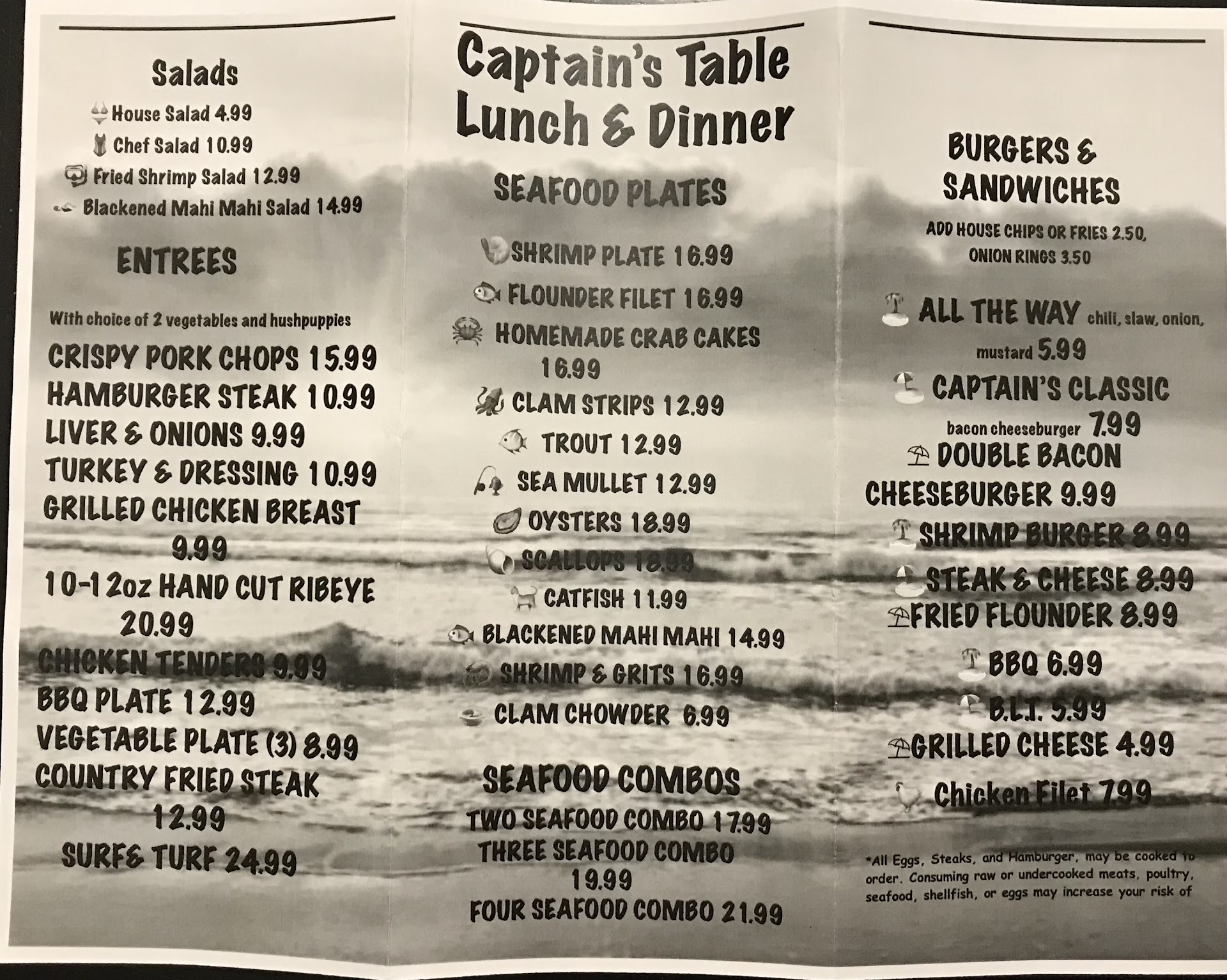 Read moreWant to know if your choice in a restaurant is a good choice? When your waitress asks your booth neighbor if they are having their usual and another waitress is eating a burger from there for their break, typically you have made a good choice. Took a day trip with my family to Atlantic Beach and Morehead City. Some people wanted seafood and others wanted just everyday southern comfort. Well to Google I go to search for a highly rated seafood restaurants. I check a few reviews out of different places and then saw Captain’s Table, over 1000 reviews and 4.5 stars, has to be good. I read the reviews starting newest to oldest. Everyone was singing their praises. So we decide to try it out. Now I will say looks can be deceiving. This is not a fancy restaurant, it looks like a hole in the wall dive, but the food was amazing! Shrimp and Grits were tasty, the burger was juicy and cooked to perfection. The clam strips and country fried steak were just as good as grandma makes. Wouldn’t have been surprised if she was in the kitchen there. And don’t get me started on their Key West Lime Pie! Talk about creamy, light and fluffy. Just delicious! Anyway go check Captain’s Table out the next time you’re in Morehead City, you will not be...
