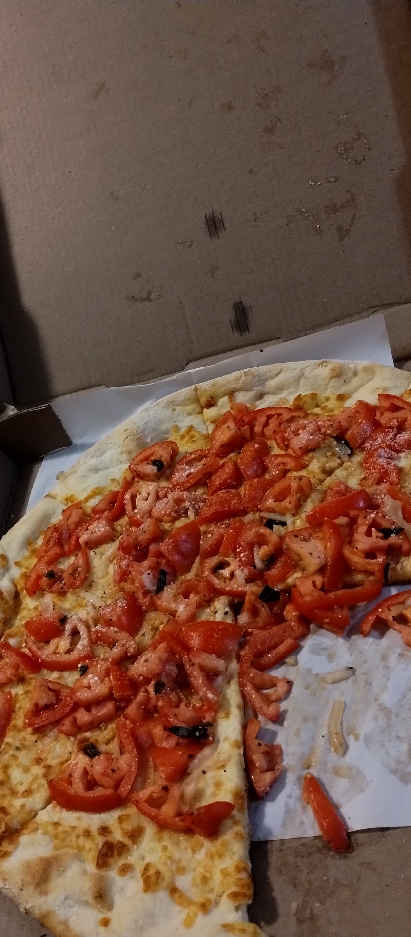 Read moreSo horrible that we had to throw away two large pizzas after trying them both from a few different slice parts. We used to get food here sometimes when visiting the area, and clearly something has changed. The pizza is completely inedible. We got 1 large with green pepper and onion (pictured) that was cold, oily, greasy, and slimy. We got 1 large bruschetta pizza (pictured) that was supposed to come with tomato, onion, garlic, and basil. As you can see, there are definitely tomatoes and onions: both very raw and chunky, the tomatoes were huge, underripe, and watery chunks that tasted awful. We think the basil is maybe supposed to be the dark green dried flecky bits on the pizza, but you can't taste anything over the fleshy watery gross tomato and raw pungent onion mixed with greasy oil and flabby, rubbery pizza crust. This was the worst pizza I or my family...