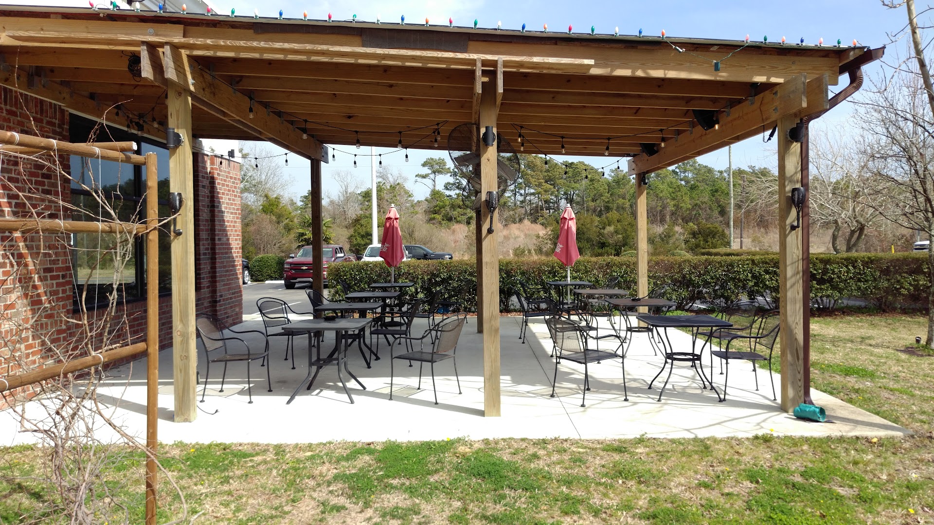 The outside patio area was very nicely done. Fans mounted above for use on warmer days and lights strung up for the evenings. Hedges have been planted around the area and were full of birds singing. In a few more years, they will probably block most of the noise and view from Mayberry Loop and North 20th street. There is even a grape arbor with a Scuppernong vine and another Argentinian variety.