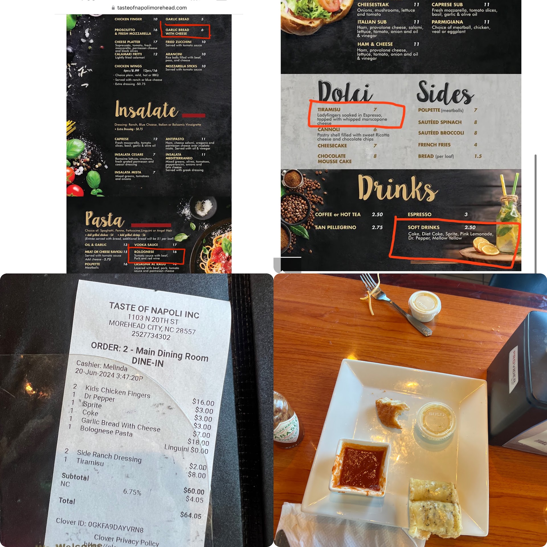 Upon reviewing the receipt further, I noticed discrepancies between the prices listed on the restaurant's website and what I was charged. Garlic bread listed at $6 online was billed at $7, bolognese at $16 was charged at $18, drinks at $2.50 were billed at $3, and tiramisu at $7 was charged at $8. There was no indication of the price for the kids' menu items. Keep in mind when I went up there I was super nice and was just like âhey I have another quick question, I just noticed the menu prices show this but I was charged thisâŚ.â When the manager walked up he rudely says âlook Iâm already doing you a favor by taking the ranches off for you. I was like well it was offered as if it was included. Technically both of them were still sitting on the table unused as well which Iâll attach the photos.