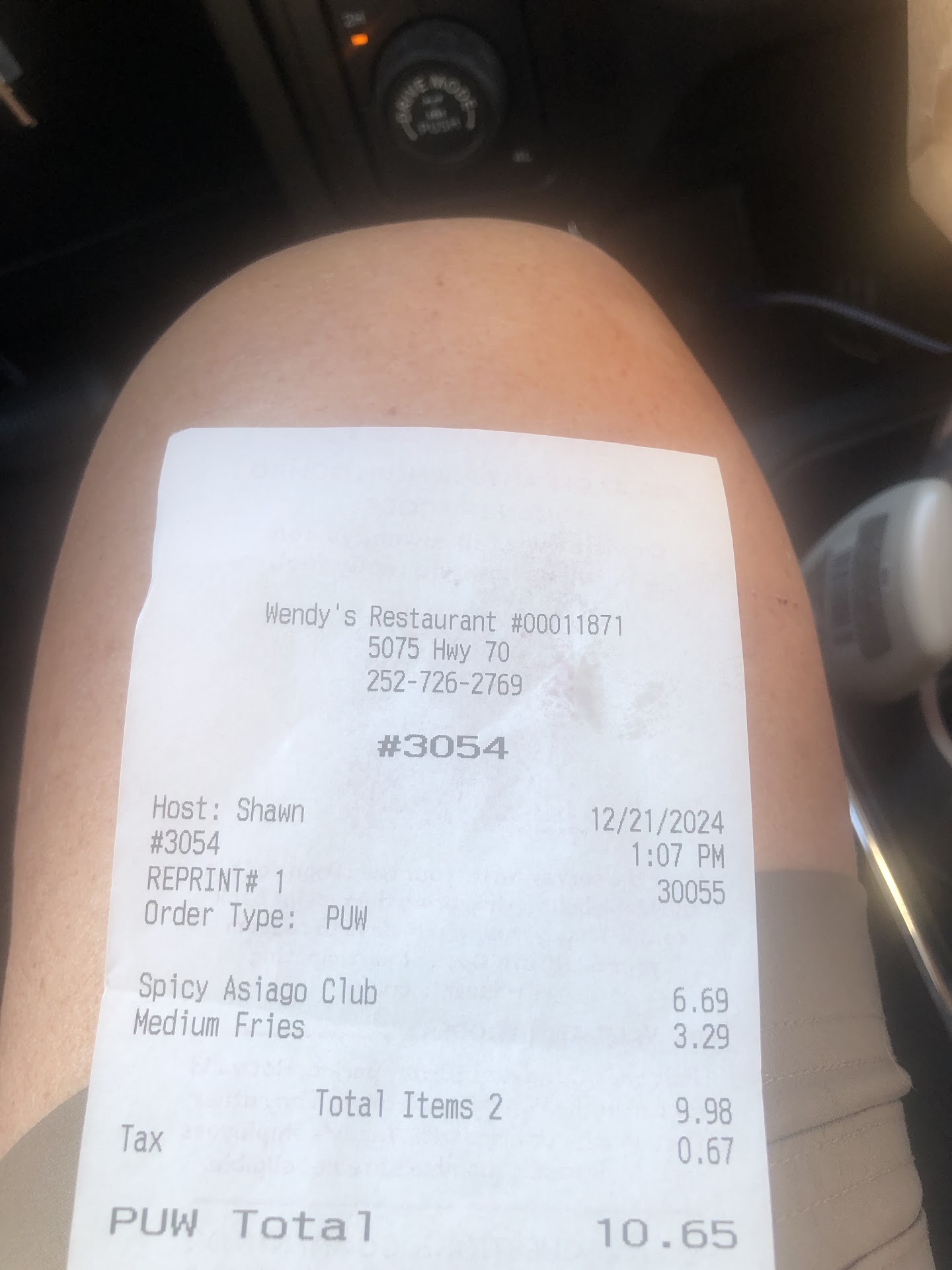 Read moreWell....... I went in to place my Order inside cause they never get it right, And the young girl was nice and receptive..at the register, I was very distinct on my orderAnd as I received my order And I spoke loud enough where I know she heard me..... but still the order was not right 2 med fries, 1plain baconator, one number 8 on the menu board ..... I ask where's the other fries.... """well you didn't pay for that.. other med fry. " the bill was $23.98........ I don't think the founder of Wendy's Dave Thomas had envisioned his restaurant being run this wayThe manager's excuse was the girl was new I said I don't blame her.....Maybe she was just trained wrong!!! Bottom line if you're going to the Wendy's in Morehead City make sure you check your order if you go inside the restaurant to order your food and if you go through the drive-thru make sure you check your order before you leave because they don't...