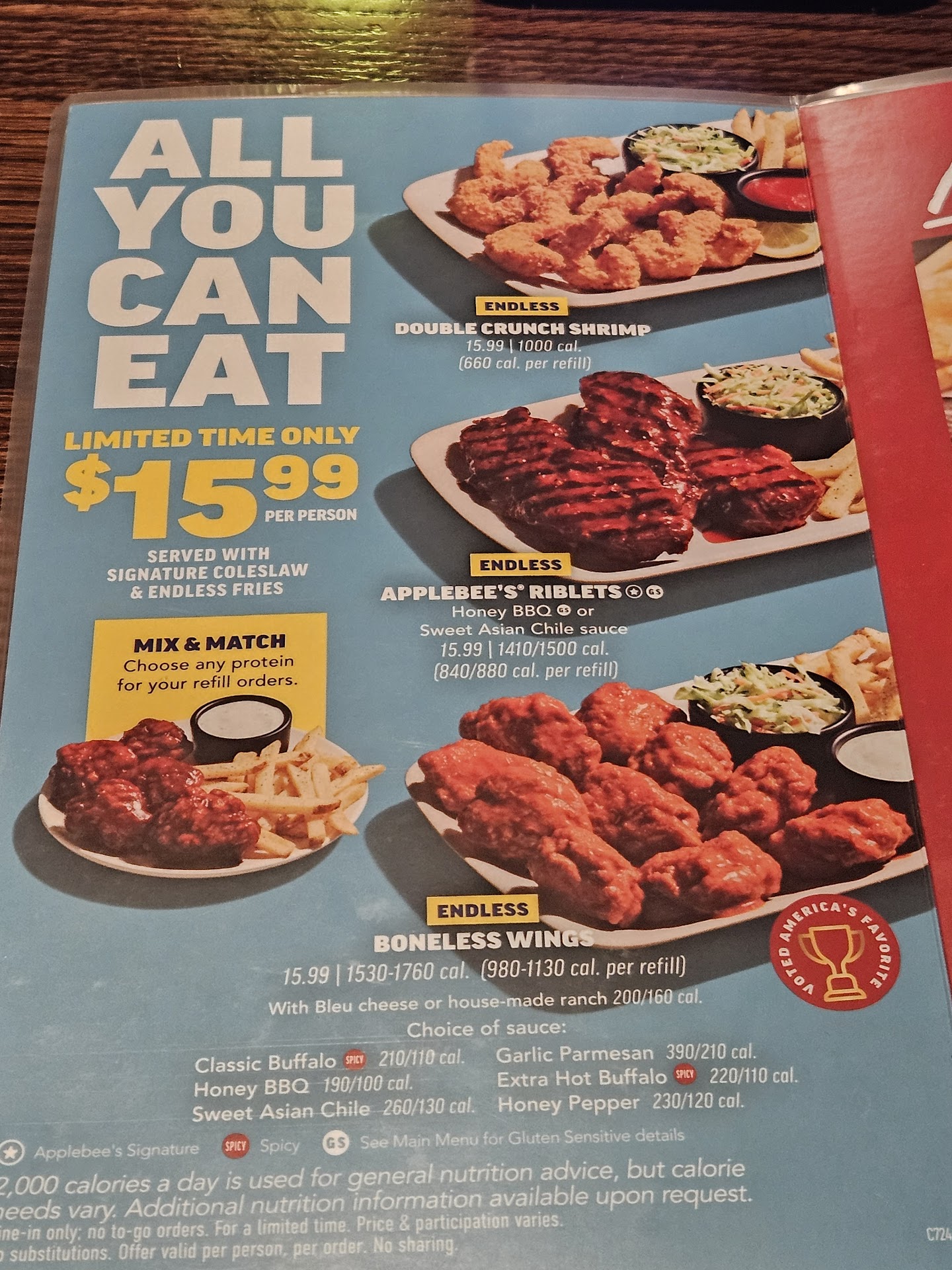 First off I would like to say that I'm not a very picky eater and it's very difficult to put me off on food. I decided to try the AYCE boneless wings, riblets, and shrimp for $15.99. I waited for about half an hour to be seated which wasn't too bad. After being seated, I waited another half an hour for a server, mind you this wasn't until I flagged a server down to place my order. After placing my order, I waited another half an hour for my food to come out. When I received my boneless wings, the wings were cold and did not even taste like chicken. I informed my server if the food can be reheated, the server brought my food back, now at this point, it has almost been 2 hours since waiting for everything. My server came back and recommended I placed multiple orders since they were backed up, so I went ahead and placed an order of riblets and shrimp. The second serving was a bowl compared to a plate which I didn't mind. Now after receiving all three featured items on the AYCE I can safely say you should avoid this AppleBees like the plague. All the food that they served was cold, almost as if the food has been sitting there all day. They didn't even bother to heat it up in the microwave. The boneless wings did not have chicken in them and were rock hard, the riblets consisted of mostly bone and was burnt but was still cold for some reason, and the shrimp was bland and had absolutely zero crunch them. I am not exaggerating when I say that even my dogs would not eat the food served here. Now I'm not sure if there was some miscommunication in the beginning when I was seated but the servers may have thought I walked in and seated myself without waiting which was not the case, so the servers decided to make my experience miserable or I was being discriminated against. Do yourself a huge favor and save your time and money. You're better off eating anywhere else. To say this place left a bad taste in my mouth is a understatement. The food is not safe for human consumption and should be investigated by the...