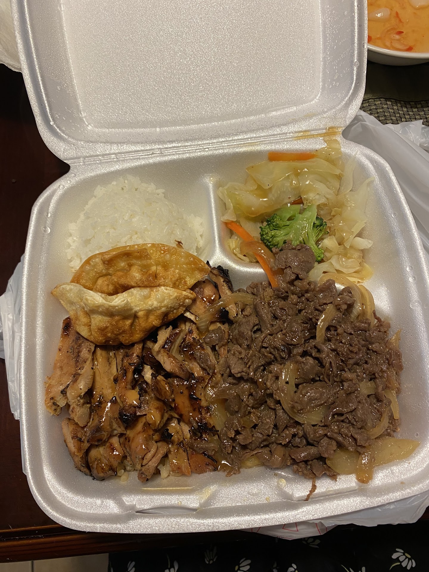 This is a go-to place for us since it's in the same parking lot as our office. I love that their food is made fresh to order and not sitting in chafing dishes waiting to be served. The chicken and beef teriyaki is really good. That's my usual order with a side of veggies over rice. The other day I tried the orange chicken for the first time and it was amazing...I think that's going to be one of my top choices from now on! The rice is always cooked perfectly and I honestly like the simplicity of it all. The cashier and cook are super nice and they will even trade out the rice for extra veggies for those of you who don't want those extra carbs. They also have a ton of smoothies and boba flavors too! I'm glad this is a place within walking distance of work. I would much rather eat here...