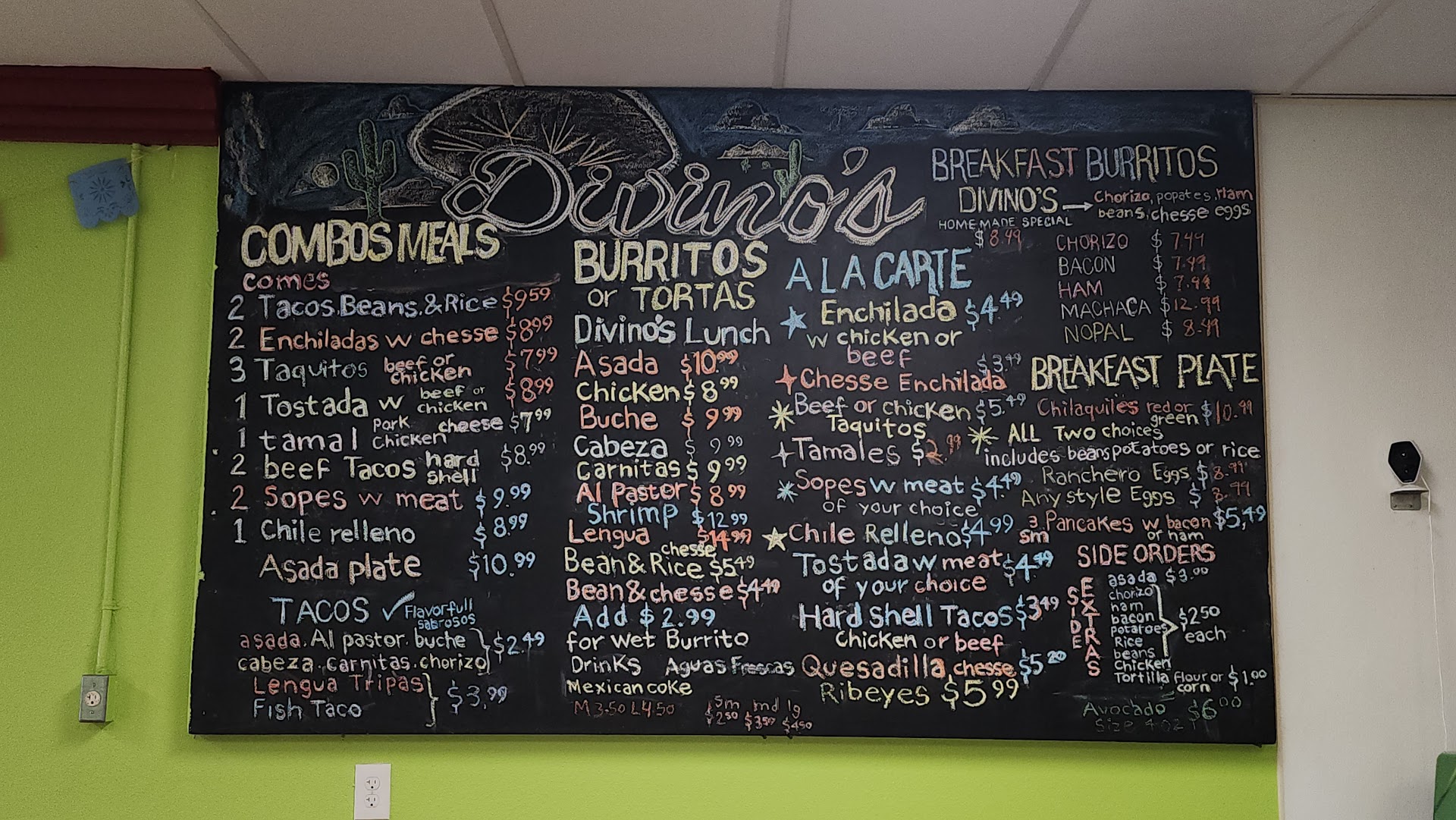 Cool little mexican hole in the wall. Service was ok she just forgot a couple items. (Can happen anywhere) The Asada is good and the breakfast burrito Divinos homemade special is pretty good. I also got the Cecina plate which im going to recommend you just go with the asada plate instead. The nopales were a bit sour (per my gf, i dont like nopales). The pork tamal is a lot better than the chicken. They do run out of pork early-ish. The rice had decent flavor just a little salty. Beans were good topped with queso fresco. The Tortillas de harina were id say a 6.5/10 The Horchata tastes like it came out of the packet. So if u like that then its good but i usually like authentic when paying more at...