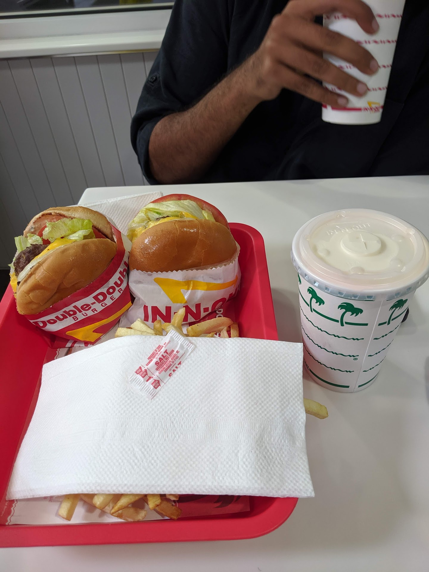 Read moreI just want to know what I need to do to get a fresh meal from you guys again, the first two times I went to in n out after I moved here, they really set the bar high and the food was so good it blew my mind, but the last FOUR times I went back for that same experience I was thoroughly disappointed. Usually ending up with a cold and stale burger in my hands that I waited 30 minutes for. Most recently, 10 minutes ago I got animal style fries and double double, the double was bearable but very underwhelming and cold, but the fries were so stale and cold with cheese and sauce, I went for a bite and the whole medium fry was nothing short of a solid STALE brick of fries stuck together. And my 3 experiences before today were relatively the same. So I really just want to know what time and what day should I show up to get a actual fresh, edible meal like what I got the first two times....