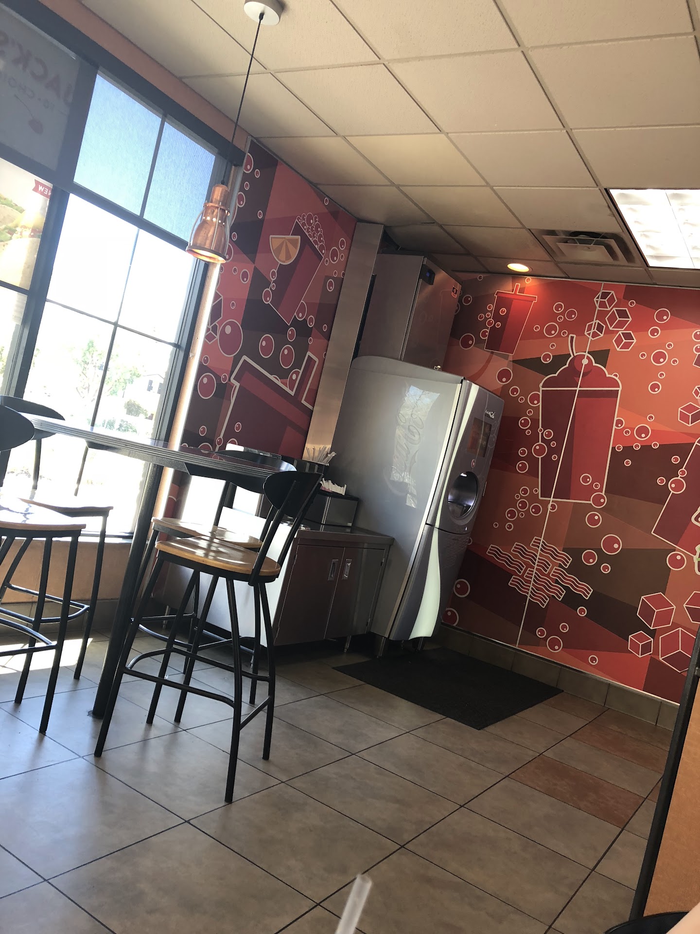 Jack in the Box is a very pleasant atmosphere very open and I love the big Windows to look out of. Plenty of seating and roomy enough to get to your table. The tables are clean and the floors are as well. The restrooms well cap and stock. When you order your wait will not be that long before you get your order. They also do senior discounts. There have been a few times that my order was wrong but when I called them they were quick to rectify the mistake and gave me a drink and sometimes a drink with french fries if they messed up a lot. But it's not that often that they get the order wrong. Jack in the Box make sure that if they make a mistake and you have to come back using up more gas and time, they show how much they appreciate your business with an apologize and by giving you a little something extra for having to come back to get your right order. Jack in the Box shows its customers that it cares for its customers and want them to be happy, that's why I am a repeat customer. Thanks...