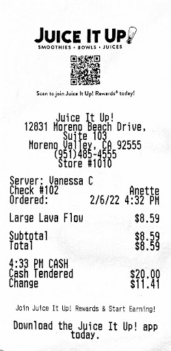 Read moreI like going to Juice it Up. I’m a regular customer. Today was not a pleasant visit at the Moreno Valley store. This was my first time stopping at this store. My daughter was visiting the ATT Store next door. So my mother in law and I walked in and stood at the counter for a few minutes. We were not greeted, did not receive a one moment please, nothing! We looked at each other and we both were thinking the same exact thing. They won’t get my money today. We just walked right out. Most locations yell greetings as you walk inside or at least acknowledge your presence. Very...