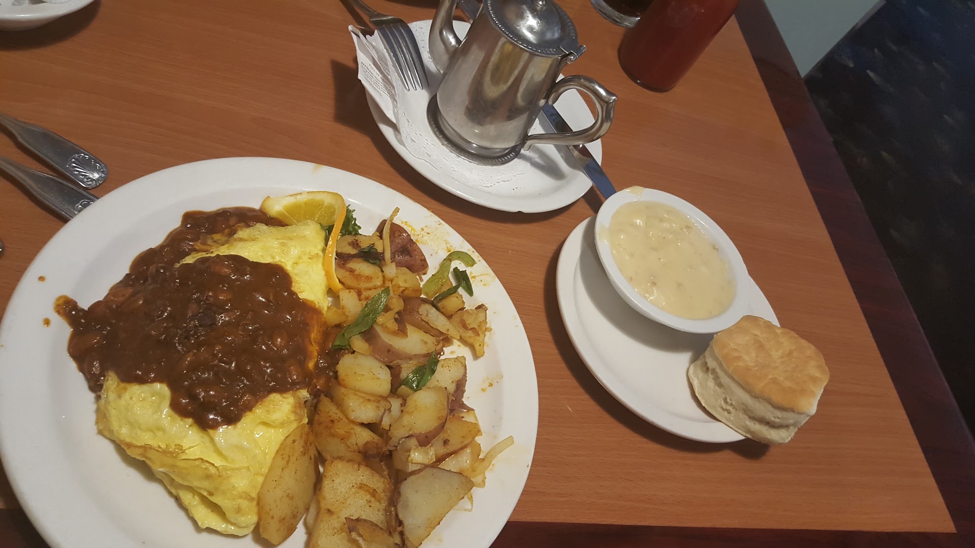 Read moreWe went for Mother's Day 2018 and we were not even greeted. There was a seat yourself sign so we picked a table where they could see us. No one showed up our table til 15 mins later and threw the menus at our table. It was a girl with short black hair. She didn't even introduce herself or anything. Then came back 5 mins later for our drinks. We placed our sons food order first since we didn't want him waiting til we decided. We ended up ordering shortly after my son and that's when the waiting begin. It took them an hour to bring our food. My bf asked what was taking so long and her response was she doesn't know she's not cooking 😑 that there are more orders. The place was empty, so it was a lie. We asked for more coffee and she said they are brewing a new pot literally after watching someone else going around.When she gave us our food we had to ask for silver ware since that wasn't provided either. I was looking fwd to eating here since it was our first time but it was a horrible experience. Then when we paid she had the audacity to ask for a tip. The 2 stars was for the food. But for customer service it was a...