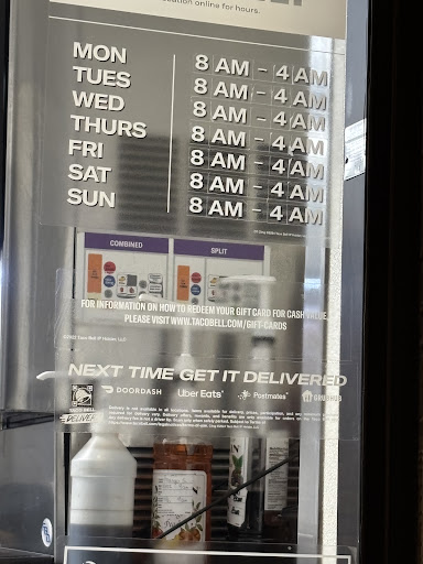 Read moreI will give this 2 stars, simply because the establishment is very clean & our order came out mostly correct. (A few stray tomatoes never hurt anyone, even if I do find them appalling.) I am not familiar with this area, but oh my. The bathrooms are locked. No they will not give you a key. No they will not give you the key to bring back after you have finished your business and are ready to order. You must order first, and then, at the cashier's leisure, they will take you to the bathroom and unlock it for you. (Mind you I was wearing a dress and the cashier unlocked the men's restroom for me. Um, no ma'am, I prefer to use a gender appropriate facility.) After two people that were in line behind us had gotten their orders, my husband had to find our order. Which meant repeating it, getting a blank look from the manager, then waiting 5 additional minutes to find the cashier who took the order! I know not to expect anything super nice (it is Taco Bell afterall) but this was just a hassle from the moment...