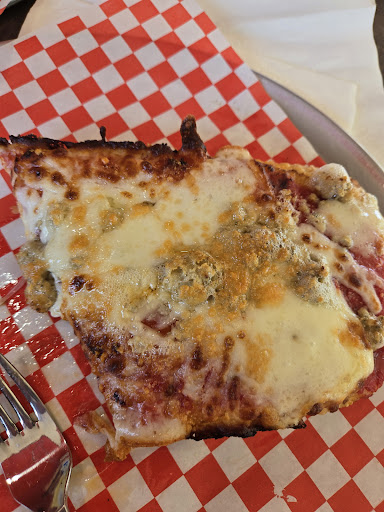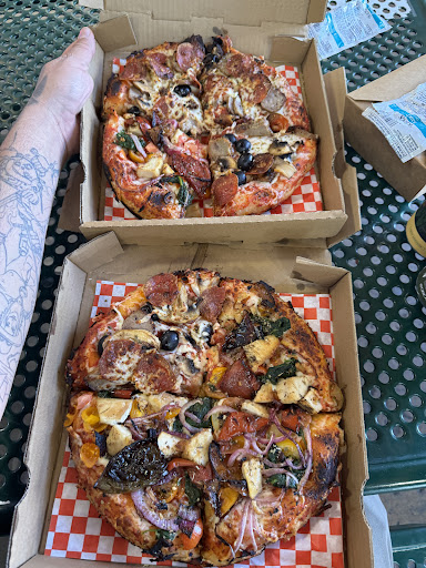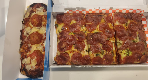 We had two of the "pizza strips", which are rectangular individual sized pizzas. They were the Pacific Coast and the Golden State. They came in drawer-style boxes, so yiu could slide the pizza out and onto a cutti g board for slicing, as the bqck of the "drawer" was open. They were about 12x4 inches and not pre-sliced. Both were very good and perfectly baked, with a crispy bottom and edges and lovely nice crumb. They were both amazing. The sauce was rich and flavorful and the toppings were very fresh. They have various styles of pizza, including Roman (12" square, with toppings typical of the Roman region), "Smile", which is calzone, Stromboli, and "Round", which is 10", or 12" for thick crust version. They are also a bakery, with a good range of pastries and cookies. Might have to get a chocolate...