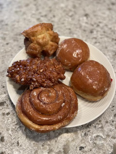 Read moreHeard a lot of good things about this donut shop. First time to check it out. It is a family owned shop. They sell donuts, bagel sandwiches, croissants and known for their burgers. The staff were all super nice. It is a small place but loved the sit at the small counter space. There were a few side table to eat at too. All 4 of us ordered Bacon cheeseburgers WELL done with 2 French fries... it came out to around $53... a little pricey. Bacon was thicker and tasty. 2 tomatoes and 3 pickles with mayo on the buns. Overall it was a tasty burger but for all of us the burger itself was NOT cooked well. Way too red for us to enjoy and love. Since the staff was so nice plus very busy... My family and I just could not complain but the pictures show the red meat. Yuck. For 53 bucks just wish it would have been cooked WELL Done like we had asked. Donuts bought separately... an apple fritter and chocolate cake donut with nuts were slightly dry. Hopefully if and when we go back, I can update and give them a 5 star rating... By the way, this is a CASH...