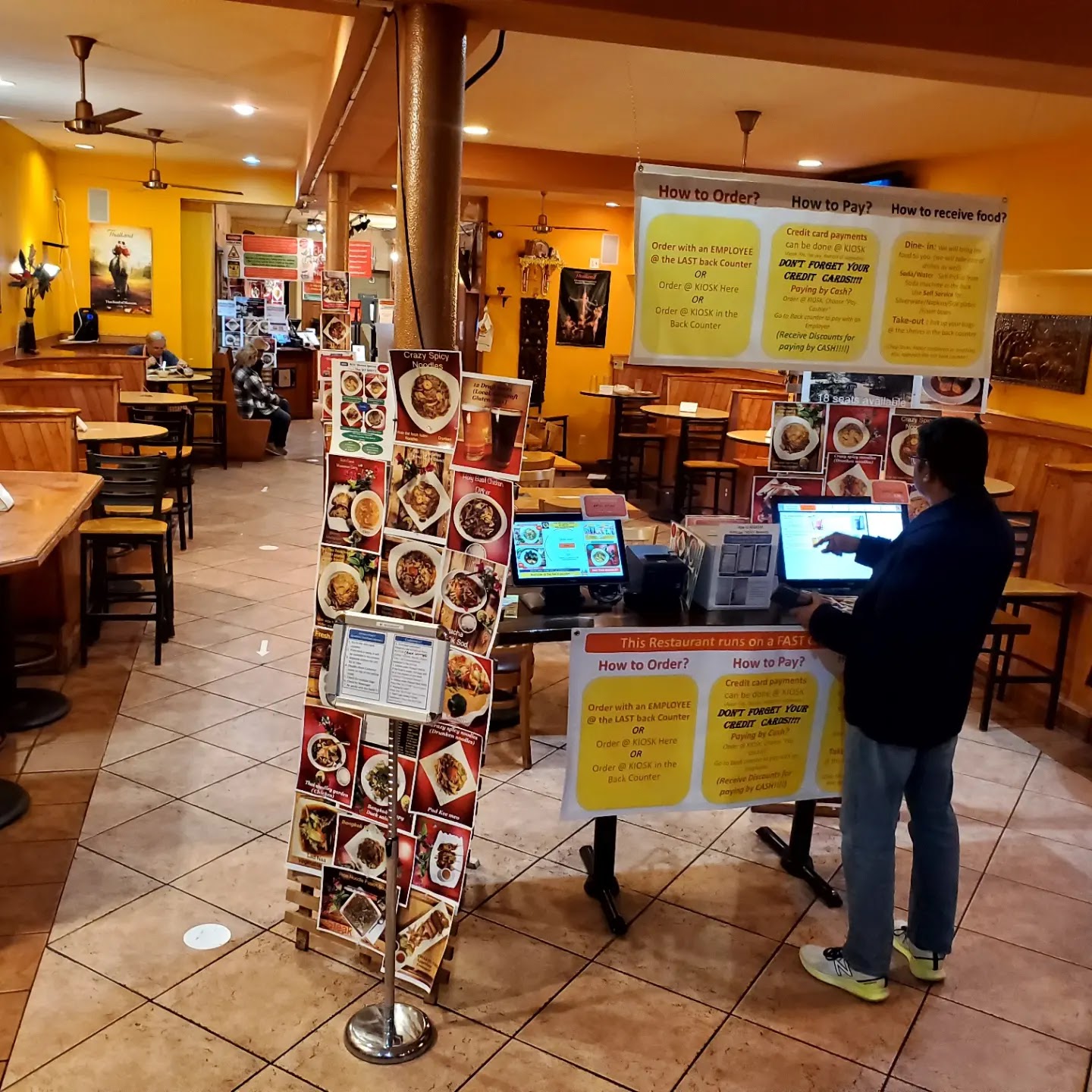 From the moment you look at this restaurant you’re assaulted at eye level by menus and signage clearly made in PowerPoint - not out of ineptitude, but because every employee seems to speak English as a 2nd or 3rd language. Airport-style arrows futilely direct you toward what Chaang Thai imagines is a normal restaurant interaction - reserving your table by flipping over a small metal “taken” indicator, heading to the touch screens in the far, far back (past where the employees exit) to input your order, then grabbing your own non-disposable drinks and silverware as you wait patiently for a concerningly thin teenager to deliver your food in total silence. The food network plays continuously on ceiling-mounted TVs, as if insisting with suspicious intensity that yes, this is in fact a restaurant, we swear.