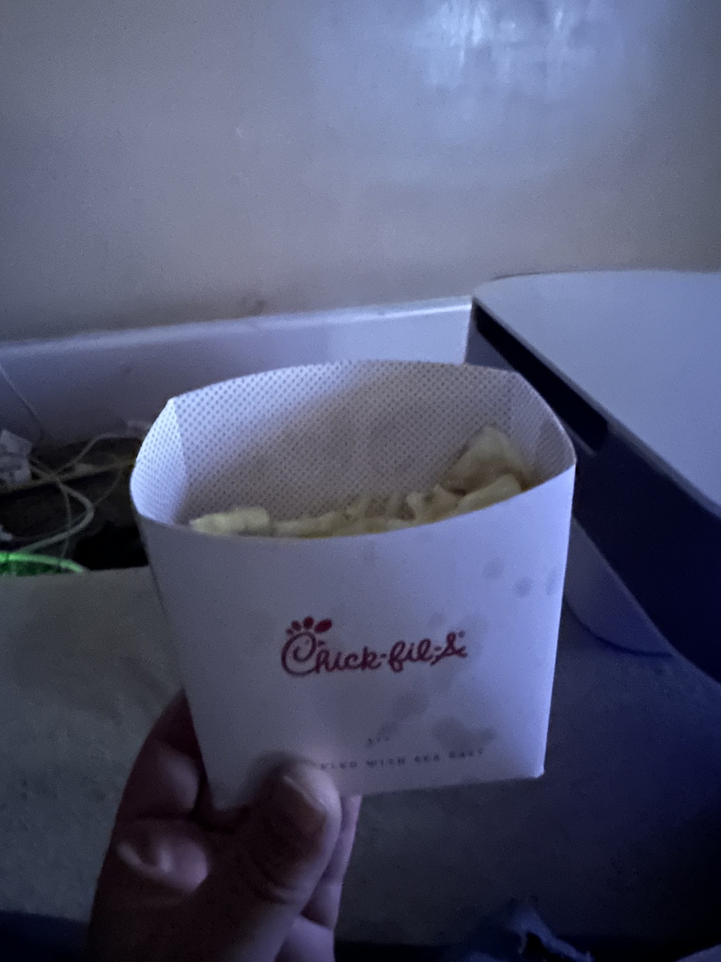 I had ordered a medium deluxe meal with a coke, my usual at any Chick-fil-A, and had only waited about five or less minutes to receive it. Mind you, they had three other registers open and plenty of people yet to serve. The kitchen was very busy, and I mean VERY. I looked behind the sandwich shelf and I could see people darting left and right. A dedicated crew, quite clearly. The only people "standing around" were the fry boy (who had his hands rather busy) and a woman who's job was to wait for special orders from the front and fold the sandwich bags (assuming those were her only tasks). I saw her disappear once, and then reappear behind the registers with a broom and dust pan, take out the trash, and return to her position a short time later.