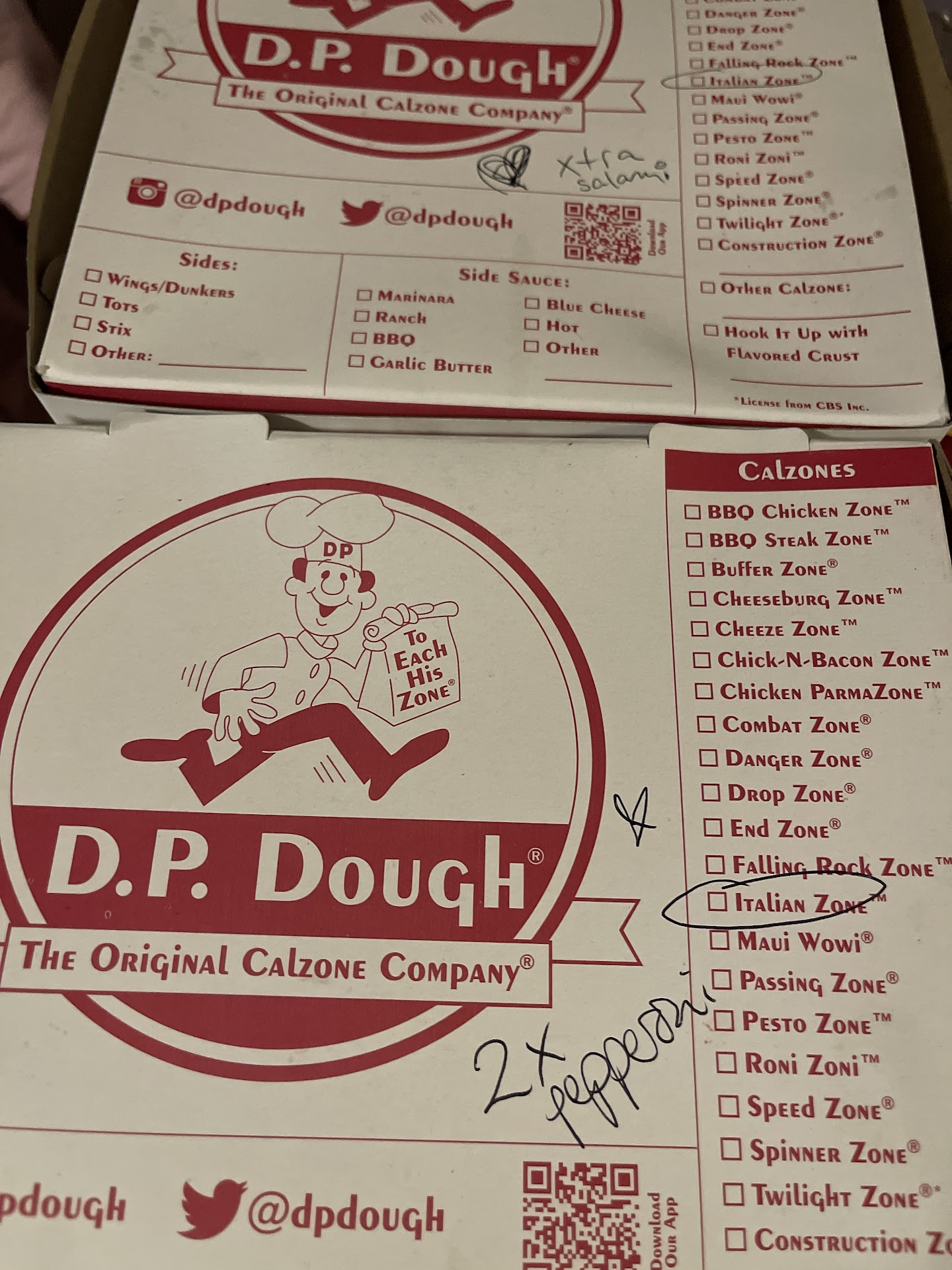 Okay, trying to be positive but they looked horrible. The dough was very thin. I've never had such a thin Zone before (but never had theirs before). There wasn't much toppings inside...barely any cheese and I paid extra for Tony's to have sauce inside which it didn't...thank goodness we had some on the side so Tony could add himself.