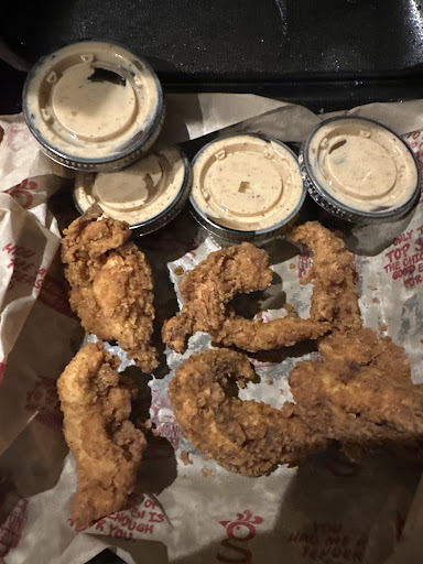 Okay first and foremost I have to say this was the best chicken tenders I have ever had! They were juicy and perfectly cooked and just so tender and delicious! The french fries paled in comparison as they seemed like frozen crinkle cut fries, seasoned with way too much seasoning afterwards. My only two complaints would be that there was quite a few flies in the dining room which was very frustrating. We sat towards the front but you could also see them back near the garbage cans. My second complaint is my husband ordered a grilled chicken tender Buffalo sandwich and instead received a breaded chicken tender sandwich. I had just got done asking the lady if they had grilled tenders without breading and she assured me they did. He specifically asked for a grilled Buffalo sandwich without breading and then whenever she asked for my order she asked if I wanted grilled also to which I replied no. But she must have keyed in wrong because while we were eating I checked and even our receipt did not say grilled. So needless to say he only ate one bite of his sandwich and neither one of us ate more than two french fries. But again my chicken tenders were top...