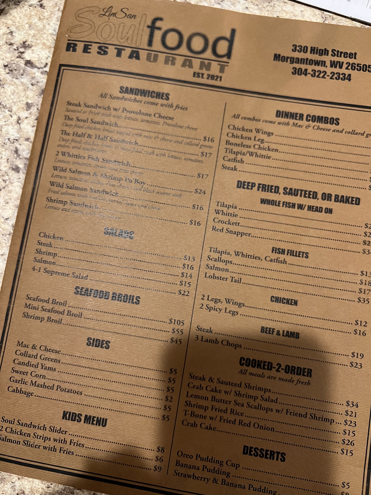 Ā Ā Ā Read moreMy partner and I are moving and received a menu from a very friendly man spreading the word about the business. We decided to go for dinner immediately after seeing that the menu looked so good. It was amazing! Iāve lived in Morgantown for quite some time and itās the best food Iāve had here. Everything is seasoned greatly, and is cooked with turkey which is what I prefer! I had the catfish with the sides it comes with. The fish was cooked perfectly and the breading is so delicious, the mac and cheese had a lot of flavor. Also, the best collard greens I ever had! My partner had the same sides plus green beans, the green beans were seasoned really nicely with garlic. We were amazed and left feeling full and happy. The portion sizes are great for the price, and the staff was extremely friendly! Iām from the South so this...