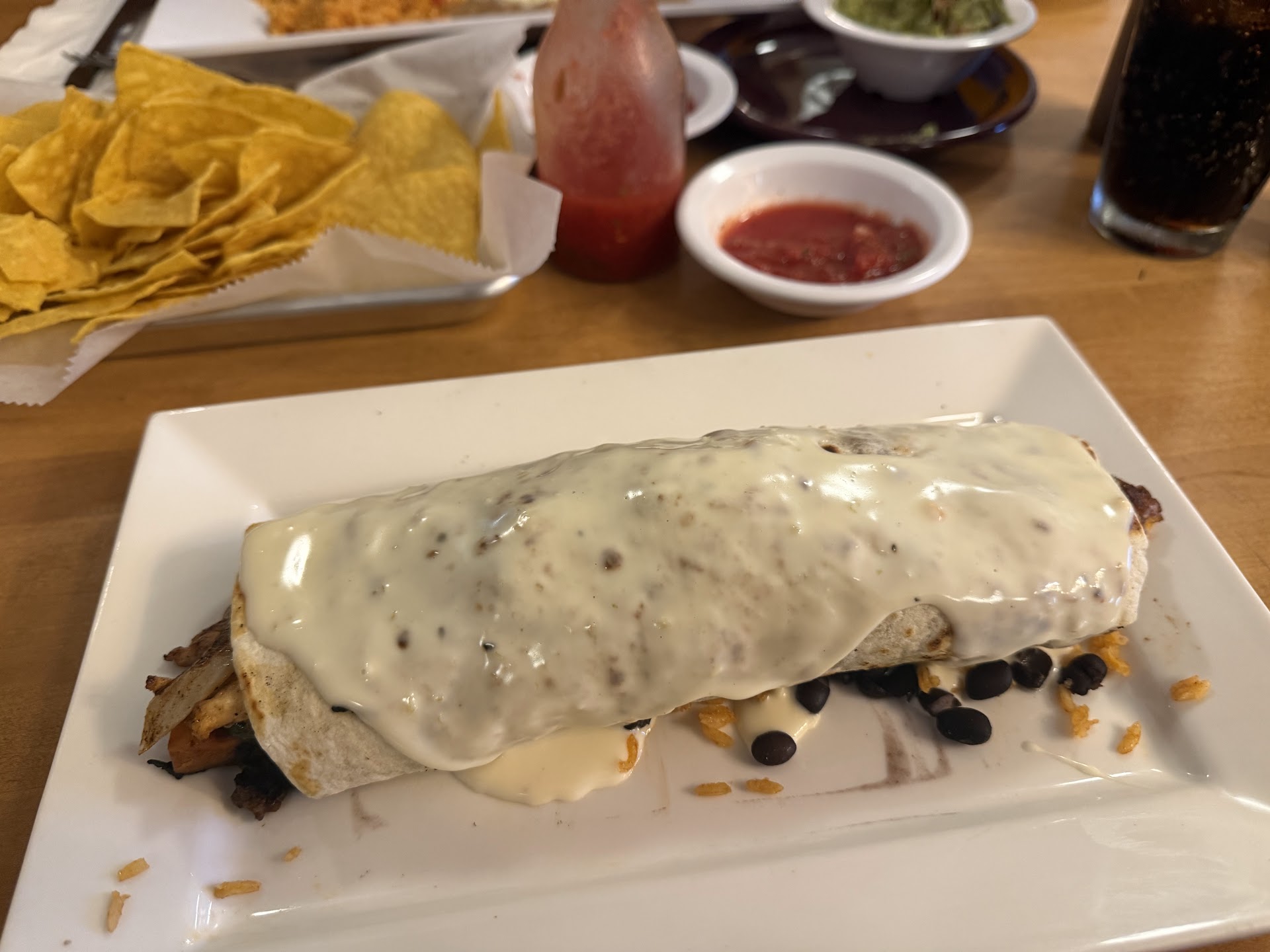 I had the cheesesteak burrito. It was filled with plenty of perfectly cooked steak. The red sauce on top was pretty flavorless, but the house made hot sauce made up for that. My lime margarita was very disappointing, especially for the cost. It had a off taste, and although it was huge, had hardly any tequila in it. They appear to not serve...