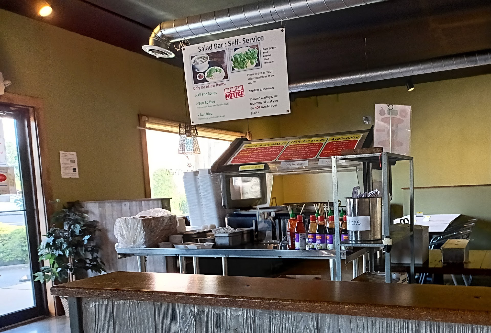 Read moreI visited this place for the first time since moving to WV from Texas back in 2020. I will say this. Right off the bat, walking into this place is just plain awkward. Unless you're looking for all of the mutlple signs telling you how and where to order, it's a bit confusing. The guy behind the counter couldn't understand me when I was asking where to order or just be seated. And he didn't speak but 2 words of English to me. Which would be fine if I'd known what I was walking into. He pointed towards what I thought was the table, which after sitting there awkwardly for 5 minutes and finally seeing the self serve signs that he was pointing at the kiosk for me to place my own order. Once you read the signs, it makes sense but even when I was through eating I was left questioning if I had to put my own dishes away too? It would be super helpful for newer guests to have someone that could at least help direct their guests on where and how to order rather than just being greeted with a hello and a bunch of pointing. In total, I spent at least 7-10 minutes in this place not understanding what to do, if I was going to be seated by someone, if someone was going to come take my order. The rules and guides are just... All over the place. Not the best pho I've had but it's the only place I've found locally. Now that I know how to navigate, I'll be back. Oh and their spicy crunchy garlic...