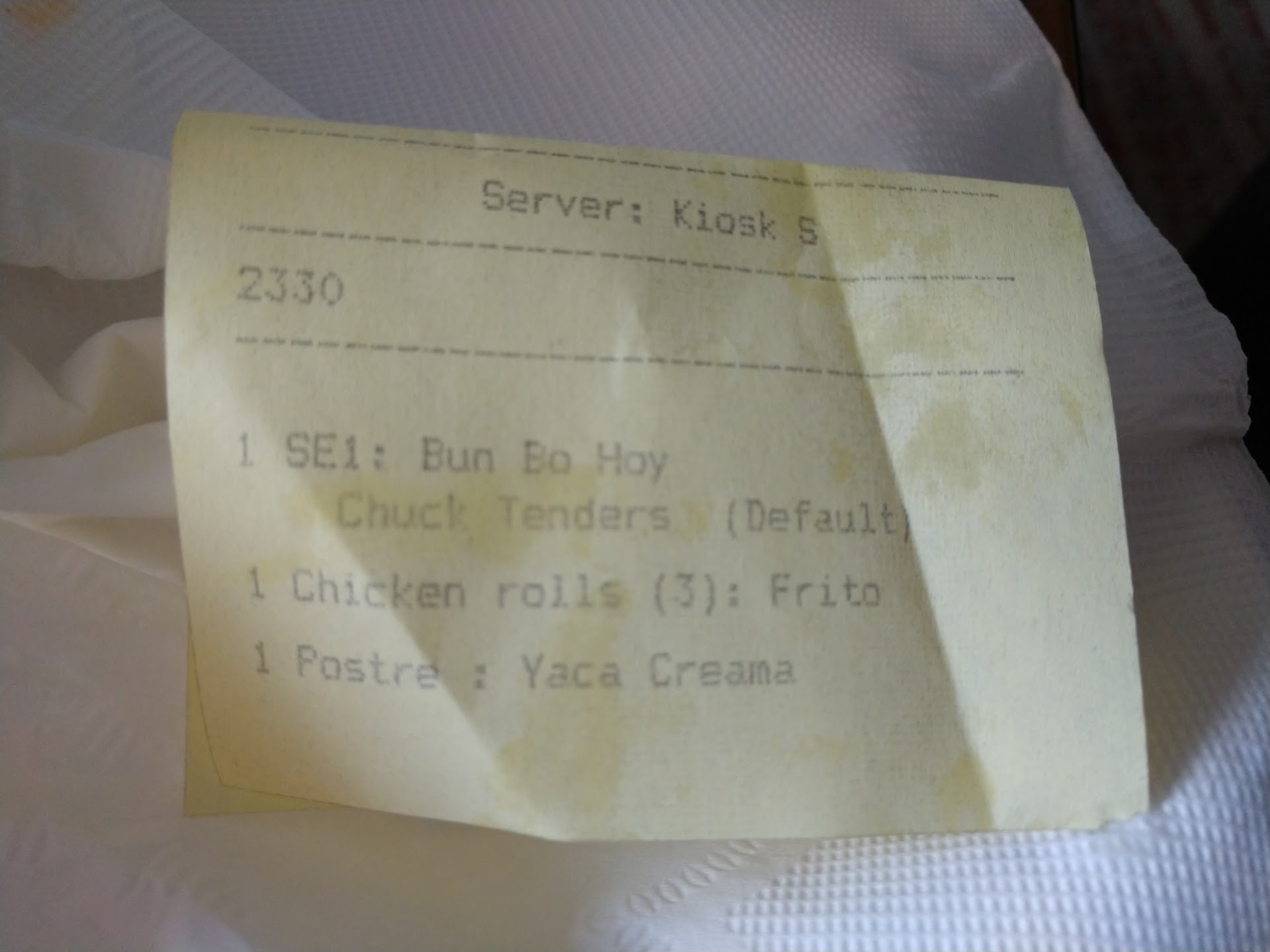 We went to salad bar and got our Cilantro, Thai basil, spices, bean sprouts and jalapenos. This was to put in our medium bowls of Pho. The food was very good. I'm still trying to learn how to use chopsticks. The fried garlic spice was good. The Pho was amazing and we had plenty to take home as leftovers but the spring rolls were horrible. The wrappers were like a rubbery covering, very thick and rubbery. I couldn't handle the texture of it. So, I broke it open and put into my Pho bowl.