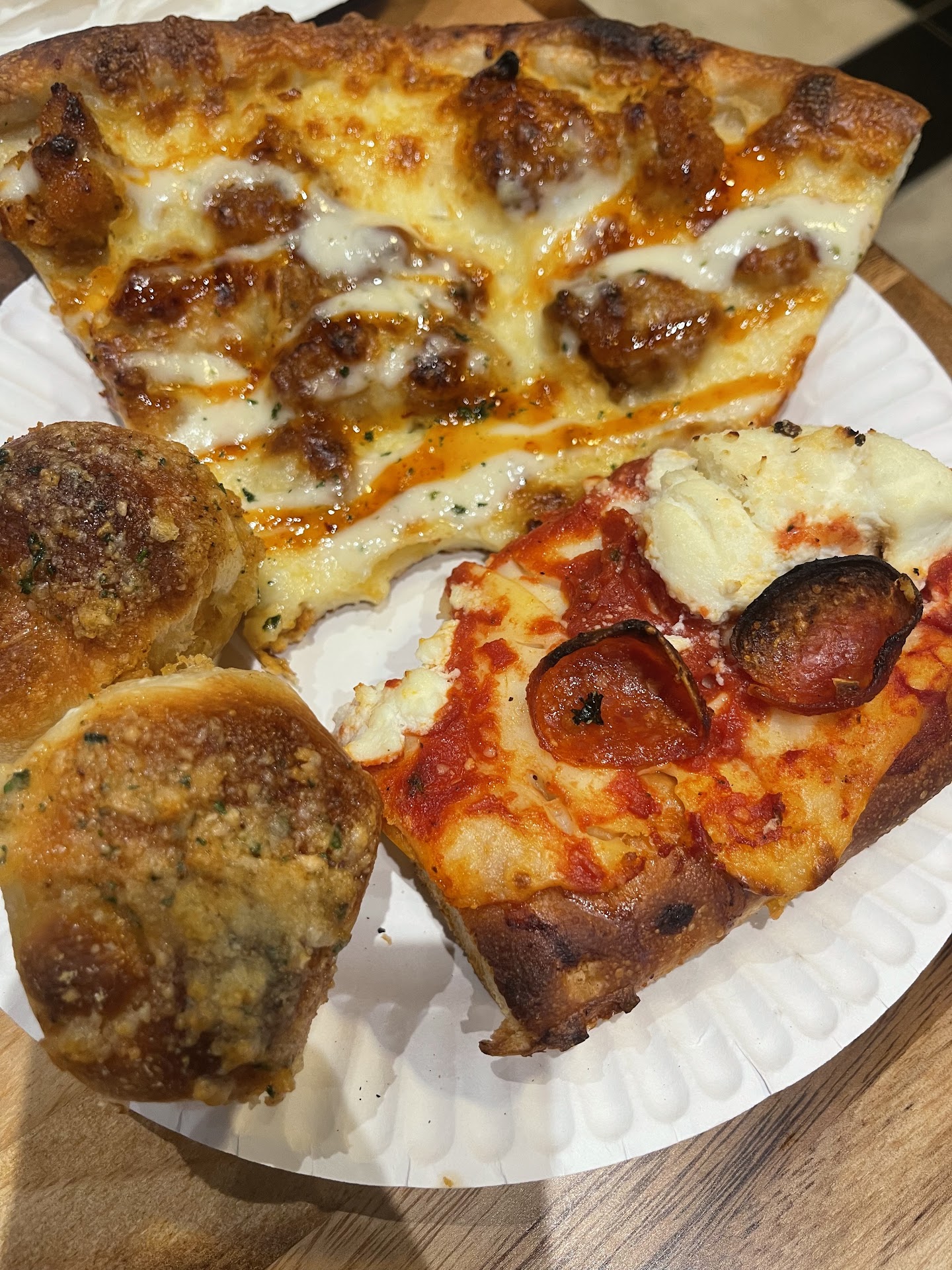 Got a buffalo chicken slice, a Sicilian hot honey and pepperoni slice and garlic knots. The buffalo chicken was terrible. Chicken was 100% frozen not fresh. Tasted exactly like a Tyson buffalo chicken tender. Buffalo sauce, or lack there of, was cheap and sparse. Next up was the Sicilian hot honey w pepperoni. Not too bad but it woulda been nice if it were actually warm let alone hot. Had to ask to have it reheated. Anddd the garlic knots. Just don’t get them. Cheap dough. Cheaper garlic. And not a drop of olive oil to be found. The cheap garlic wreaked havoc on my stomach for hours after and I eat garlic all the time. Oh and the marinara dipping sauce woulda been decent if it wasn’t watered down to the point of being pure liquid. One and done. No thanks. Too many better options in the area to drop $5 a slice on mediocre pizza at best. Seems like they went with quantity of options over quality options. Service was good though.