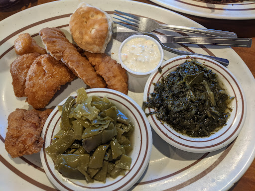 My sister & brother-in-law took me for all you can eat chicken tenders, catfish & bbq last time I visited. The restaurant was packed when we arrived & we had to wait a minute for them to clean a table for us. I started with chicken tenders & catfish & opted for collard greens & green beans for sides. The greens were flavorless, but the green beans were good. They weren't overcooked & they were well seasoned. The chicken tenders were okay, but the catfish was absolutely amazing! It was perfectly battered, perfectly cooked & served piping hot with tartar sauce on the side. I have to say the catfish was second best I've ever had. It would have been the best, but across the table, my brother-in-law was brought way overcooked catfish that was dark brown, crunchy & dry. Fortunately my sister's catfish was like mine. When I reordered, I only requested catfish as did my brother-in-law. The server brought a plate piled with catfish - some looked gorgeous, cooked perfectly while others were bordering on burnt. One thing I really like about this restaurant is they allow you to change your sides when you reorder. I tried the fried apples & coleslaw & greatly enjoyed both of them. The coleslaw was finely chopped & refreshing. The fried apples were still slightly crisp with a tang. I would return to this restaurant, but next time I'll review the check before paying because when we arrived home & looked at the receipt, we were charged twice...
