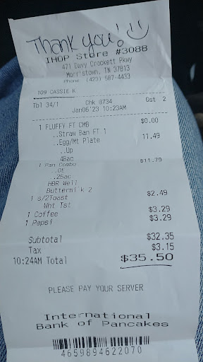 Read moreMy granddaughter and I went to IHOP in Morristown because she was wanting their cinnamon pancakes and hash browns. I ordered the pot roast with mashed potatoes & broccoli & cheese. We sat for over 15 minutes waiting for someone to take our order & get drinks. Finally a server came over & was obviously mad about something. She said “sorry there was a mix up about tables”. So we ordered & she brought out drinks a few minutes later. When our order came out my granddaughters pancakes looks like someone had spilled the bottle of cinnamon on them, they were completely covered with cinnamon and she had a slice of cold cheese on top of her cold hash browns. Why, I don’t know. My whole meal was cold , even the plate. When I told the server she said she didn’t know why, that it just come up. She also asked me how I wanted the cheese on the broccoli, like a slice or what. This was after she gave me my food. I told her forget the cheese and to just microwave the food a little. The roast beef literally looked like someone had opened a packet of Caesar wet dog food and put it on my plate. It was total mush and tasted as bad as it looked. The potatoes were dry and the broccoli wasn’t good without cheese. She them brought my granddaughter another order of hash browns because the first order had a slice of cheese on top, which I’d say was probably supposed to go to another customer. Our server seemed absolutely miserable. We never got any drink refills and my granddaughter said she saw our server with her coat on and a drink in her hand leaving the restaurant. We asked another server for a to go box for my granddaughter and when she brought it back she smelled like a dirty ashtray.. I get people smoke but at least wash your hands or try to wait until it’s slow to go smoke. Needless to say we will not be going back there. I did not want to go to begin with because I knew this IHOP didn’t do much business and the food was not good the other time I went. Our meal was almost $40 for pancakes that my granddaughter only ate the center out of and cold hash brown. I couldn’t eat my food it was so bad. And almost $4 for 1 glass of tea...