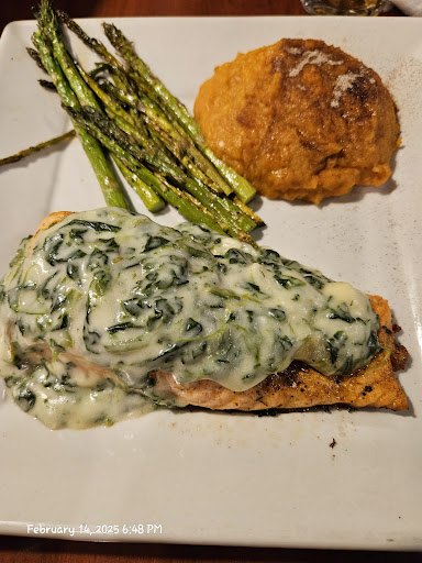 (My spinach covered salmon was delicious and worth every penny also!!!, My teen enjoyed her Garlic Steak Alfredo -minus the spicy factor that wasn't mentioned on the menu. Also the steak portion in the pasta was rather small for the $18.99 price. My other two smaller children got an adult steak meal and corn dog meal to share and they enjoyed them, I actually tried one of the corn dogs and a bite of their mac and chsse left over and it was very good! I do wish they had a kid's meal steak...