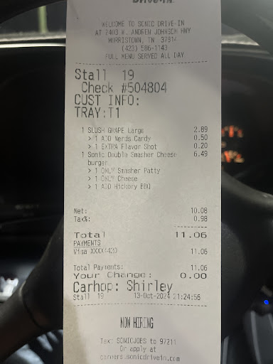 The Sonic at 2403 W Andrew Johnson Highway’s service all around has gone completely down hill. Their slushie machine has been “down”for weeks,the food isn’t what it used to be and I’m not sure who is in charge of hiring employees there but they might want to investigate the two dark hairedgirls that work the drive through window (because the stalls haven’t been open in quite some time so the same two are always on drive thru.) because Everytime me,or one of my friends or one of my coworkers go there and they are working,there is always an issue. They either can’t take debit cards because their systems are always down is what they say and then say they have to take exact change because they don’t have enough to give you change back,meaning if all you have is cash and you don’t have time to go somewhere else ,whatever change you would have gotten back you won’t be getting back and I think that they do that on purpose because it happens quite often and they know that there are people who will just tell them to “keep the change”.