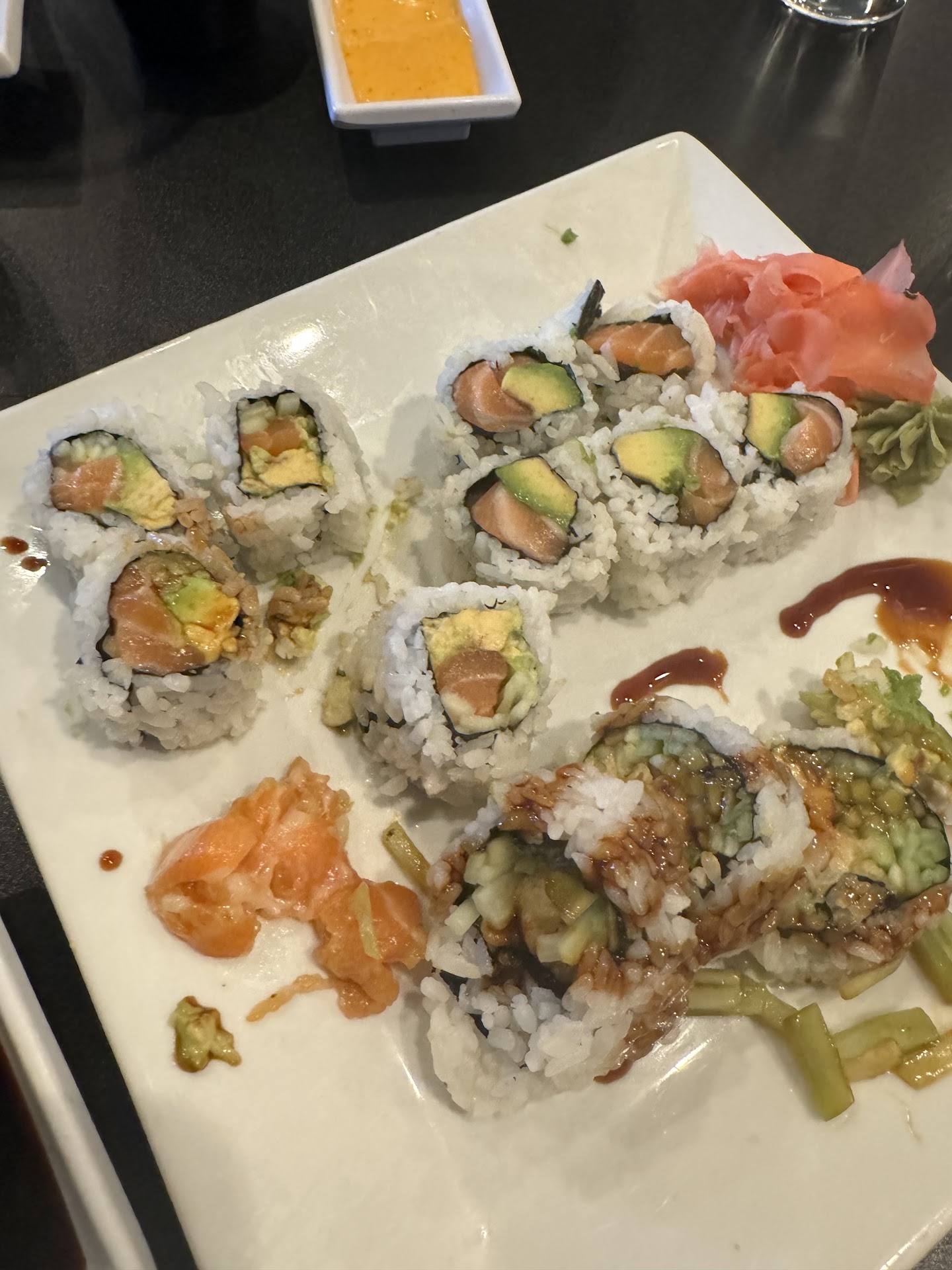Regarding the sushi itself, it was very good. Below is the picture of the plate of sushi that I received. The manager made a comment about how she was curious if I could eat it all. I ate all but two pieces. I was stuffed. If you are going to order some sushi and you do not want to get this much sushi, I highly recommend you order the striped bass and the salmon. Both were on par with some of the best I've had around the country, including both coasts of sushi.