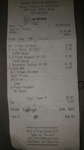Read moreNormally when we go to this particular one service and food are pretty good. But tonight we went and my son had a list of food we were getting because he figured up what everyone wanted and how much it would cost. We get up there, place our order (total is about $6-$7 more than he figured from online prices) and wait a few mins. We didn't think too much about the price difference because online prices usually differ anyway. I tell him just to check the receipt vs the online app and that's when we noticed why it was so high. He'd ordered 2 bacon double stacks but they charged and gave him 2 double baconators instead. So I tell him to call and let them know that they'd messed up on the order and what it was. NOW this is the reason I'm leaving the review.... during the call I hear her tell him he can bring them back up there and trade them in for the others and get the difference. I wanted to throw up hearing that! It made me wonder how many other orders they've messed up on and traded out prior. I always thought that fast food places weren't allowed to take back food once it's touched the customer's hands due to cross contamination and health violations. Thought others might like to know for...