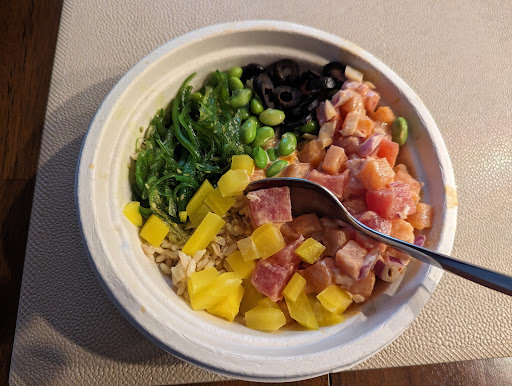 Generous portions - except for the actual amount of fish. I'm no poke snob, but typically when you order poke, the highlight of it is the fish. I've been here two times, and both times I got a laughably small amount of fish in my bowl (two tablespoons). The most recent time I went there, I was so confused by the fish-to-rice ratio that I had to ask the person serving me if they were being serious. I said something like "the amount of fish I'm getting is very small (nervous laughter). Are you sure?", to which she replied, "yes. the fish very large. We cut big fish into small pieces." Not sure what to make of that response, I blinked awkwardly...but I ended up with an extra spoonful of fish, so I think I got my point across.