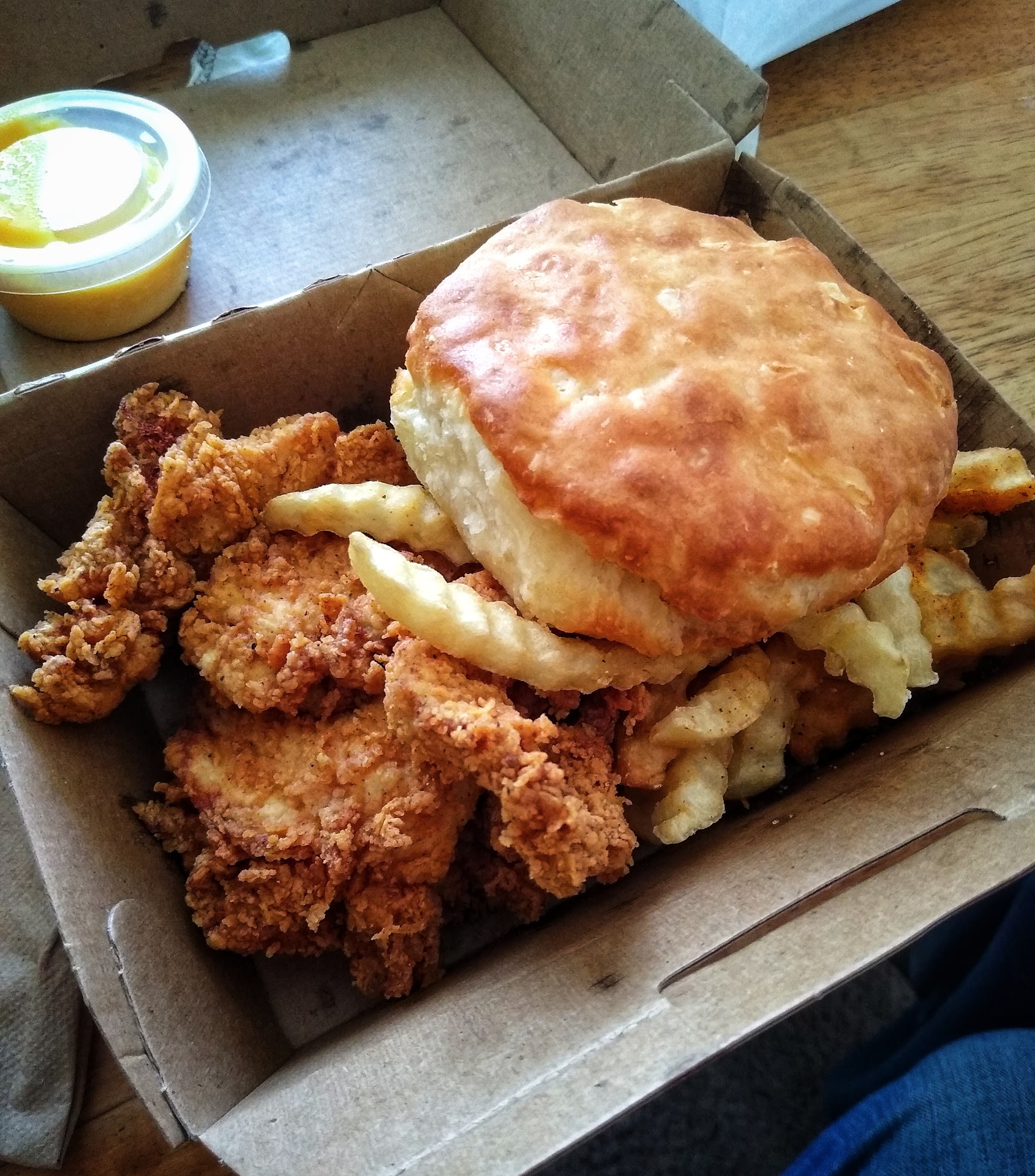 My husband and I tried this place today for the first time and we were impressed! Donuts are amazing but a bit pricey. I tried the chocolate icing and my husband had a blueberry biscuit both of which we enjoyed. According to my husband the biscuit was very moist, not dry at all and the blueberries were just the right amount of sweet. Biscuit was reasonable size. If you are a fan of chocolate like myself you will love the chocolate icing donut I could’ve had two! We both had the spicy chicken biscuit which was decent. It was almost as big as my infants head! (ok maybe not that big but a pretty fair size) they will fill you up for sure. It could’ve done without the jalapeños though, it was a bit much and I felt like it overpowered the sauce it already had on it. The hush puppies were to die for!! It’s a must to get along with your biscuit. Not your traditional kind. They have cheese inside and as soon as you bite into it, it just melts in your mouth such a soft texture full of flavor!! It’s the second thing I enjoyed the most first being the donut and last being the biscuit. They only come in a four count though wasn’t enough for us to share haha! Will definitely be getting more next time we go. The place is mostly for grab and go I would say as there isn’t much space to sit down and eat besides outside. Biscuits are reasonably priced but drinks and other small items are overpriced. A coffee & water were $3 each while the donuts are nearly $2 I must say they are worth every bite though. I was satisfied as so was my husband and will be coming back to try other things on the menu. Overall a good place to try if you’re looking for...