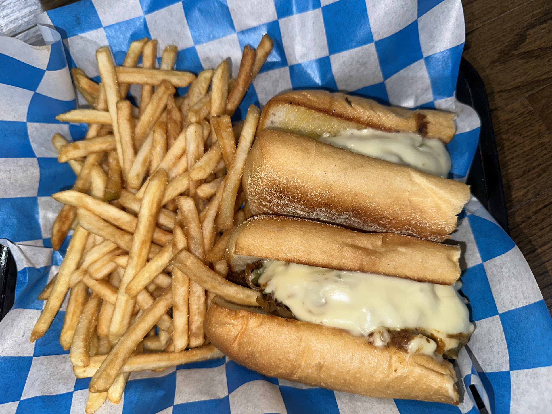 At 6:50pm, we ordered mozzarella sticks as an app. At 7:02pm, the waitress finally returned, which I felt was too long as we knew what we wanted shortly after placing the order for the appetizer. I got the bbq chicken Philly with fries. I also ordered a sweet tea. My date got the classic cheese burger with an extra patty. I received my sweet tea fairly quickly.