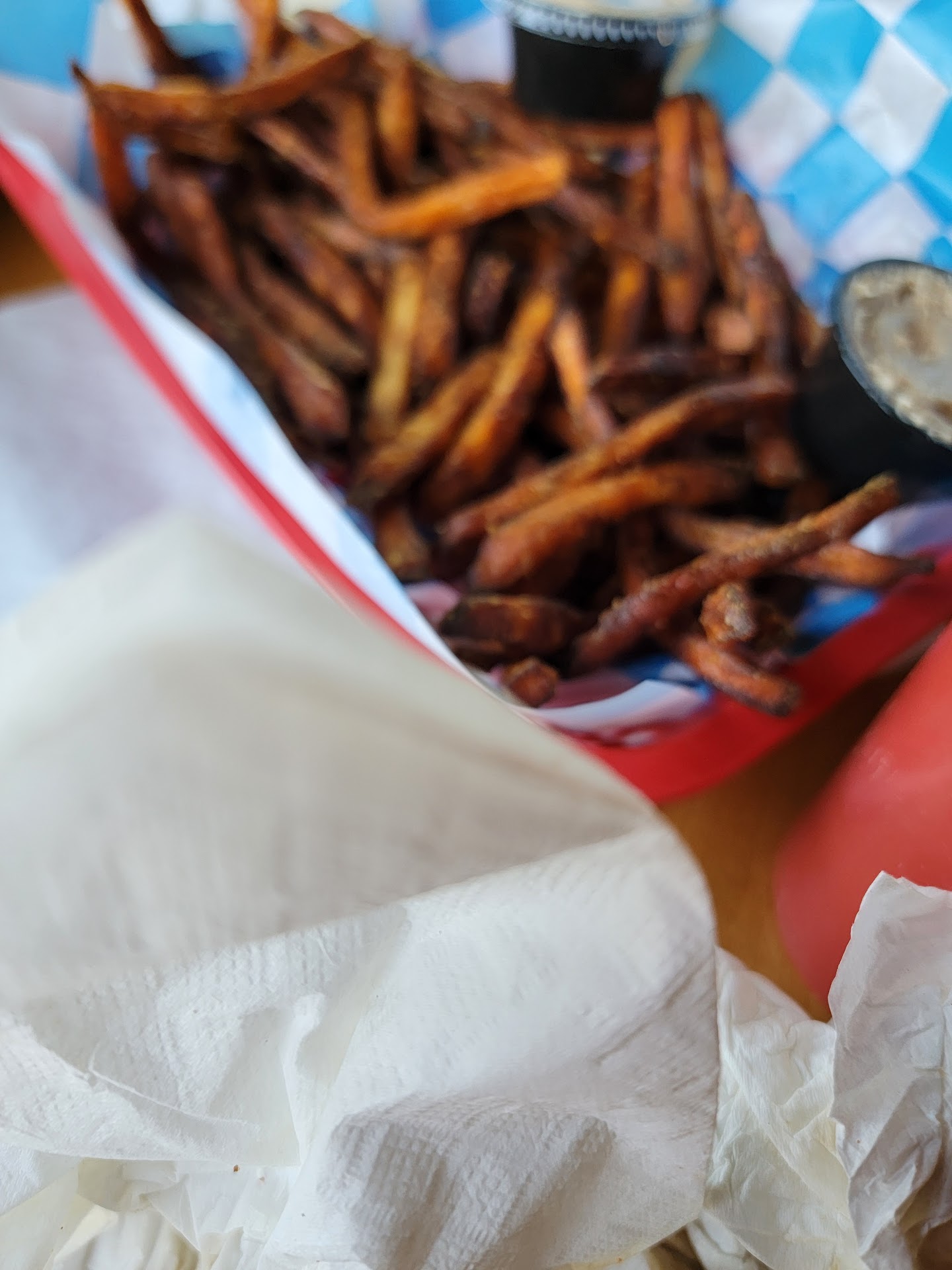 Our food arrived at 7:37pm, which was 35 minutes after placing the order. My fries were barely warm and a little salty. My bbq chicken Philly was hot, fresh, and delicious! Wow! My date’s sweet potato fries were pipping hot and they were delicious! It comes with a cinnamon type sauce that was tasty too. My date has been here several times before and they always get the sweet potato fries. It is a $2 up-charge but I recommend getting it!!