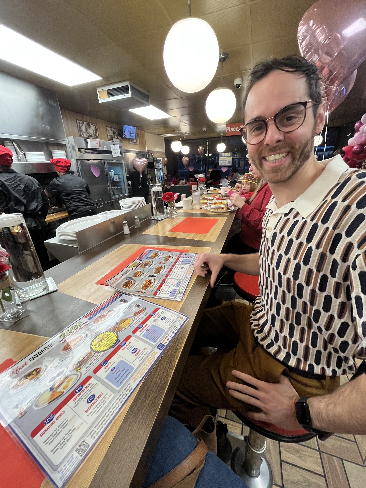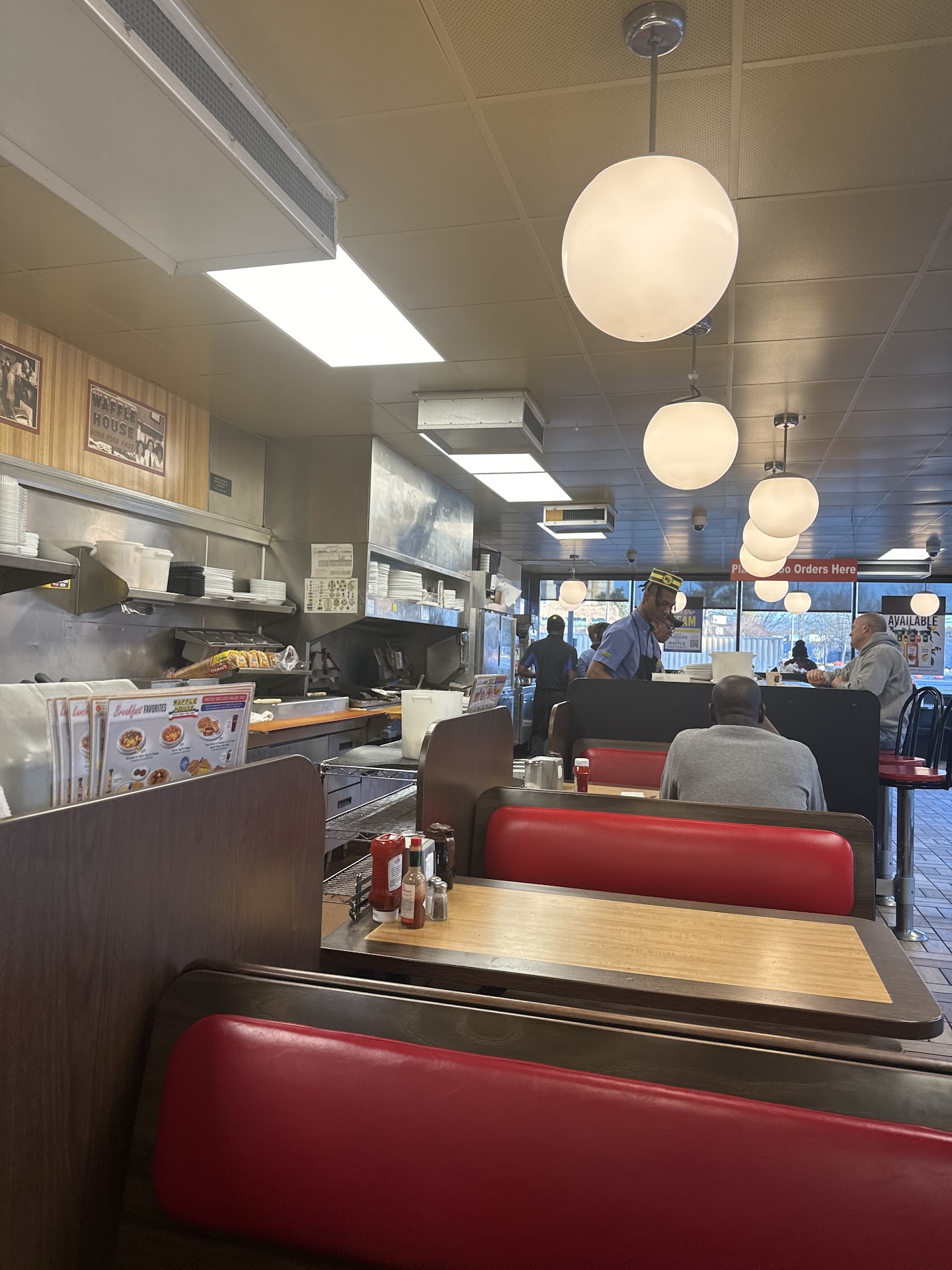 From the moment we walked in, we were greeted by the most romantic ambiance Iâve ever encountered. The familiar glow of neon lights cast a soft, almost ethereal hue over the diner, and the sound of sizzling bacon played like a love song. There were heart-shaped balloons floating in the air like Cupid had personally hand-picked them, and the booths were adorned with little red and white streamers, as if Waffle House had somehow turned into a Parisian cafĂŠ overnight. But, honestly, it was better than Paris. It was Waffle House on Valentineâs Day â and thatâs where magic happens.