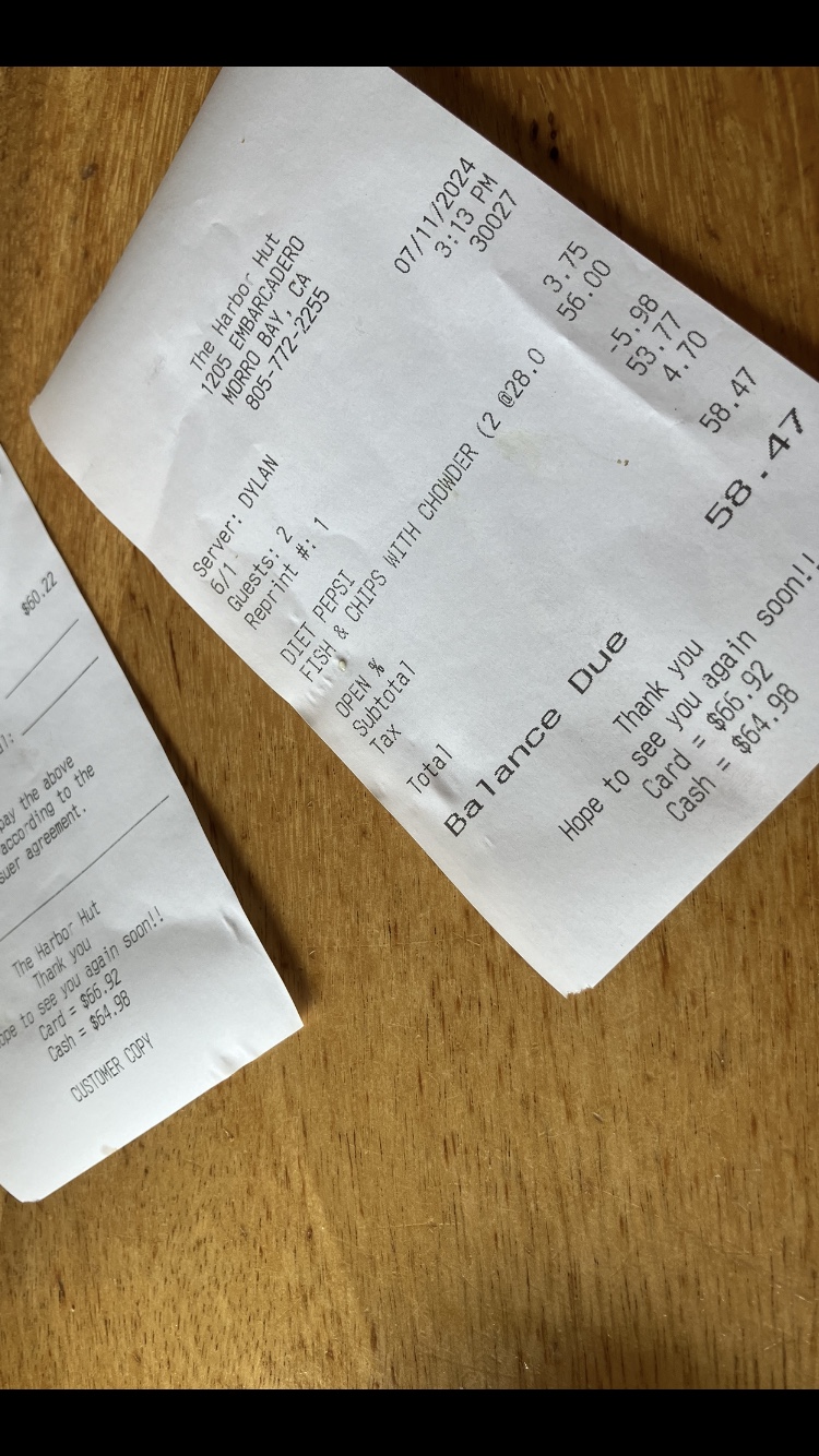 Read moreHarbor Hut gets a one star because of the service alone. Almost didn’t go here because the reviews about the food so they were soggy. The food turned out to be very good; however, the server handed us four totals. And continued overcharging us for everything, (receipts attached) We ordered one soda and two plates of the fish and chips with clam chowder and garlic bread. They were $28 apiece. The soda was $3.75. She then put on a military discount of 10% which brought our total, after tax to $58.47.
