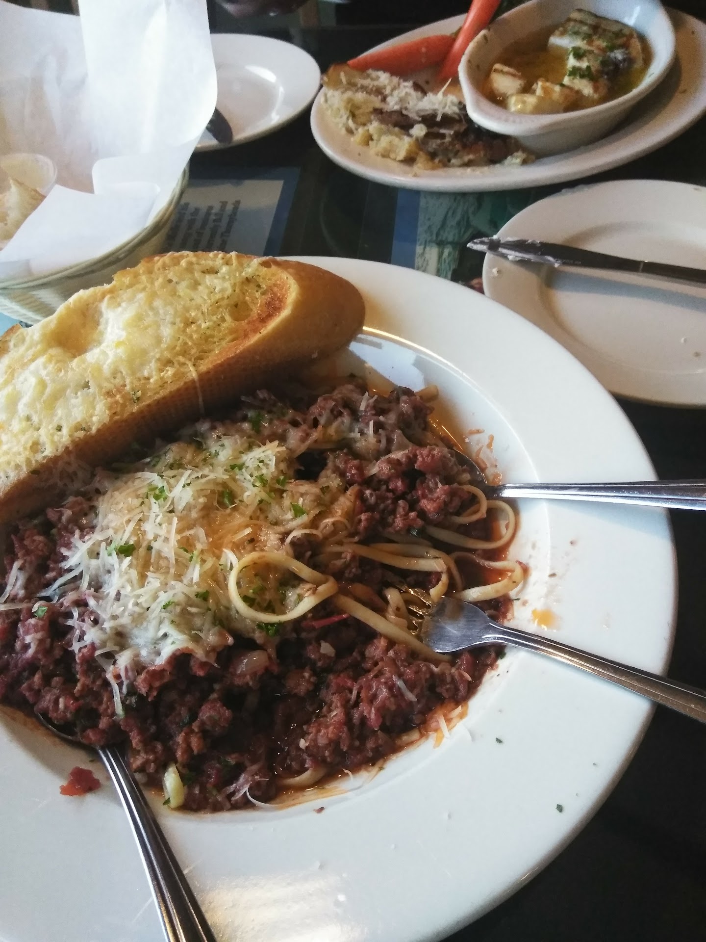The "spaghetti and meat sauce" (actually linguini, as all their pasta dishes are) had more meat than noodles and tomato combined! I mean, you're definitely getting your money's worth of meat, but I would have actually appreciated some more pasta. The ratio was ridiculous and it made the sauce very greasy. It almost appears as if they didn't drain any grease from the meat at all. I couldn't eat all the meat. Cheesy garlic bread is complimentary with pasta, but you have to ask for it.