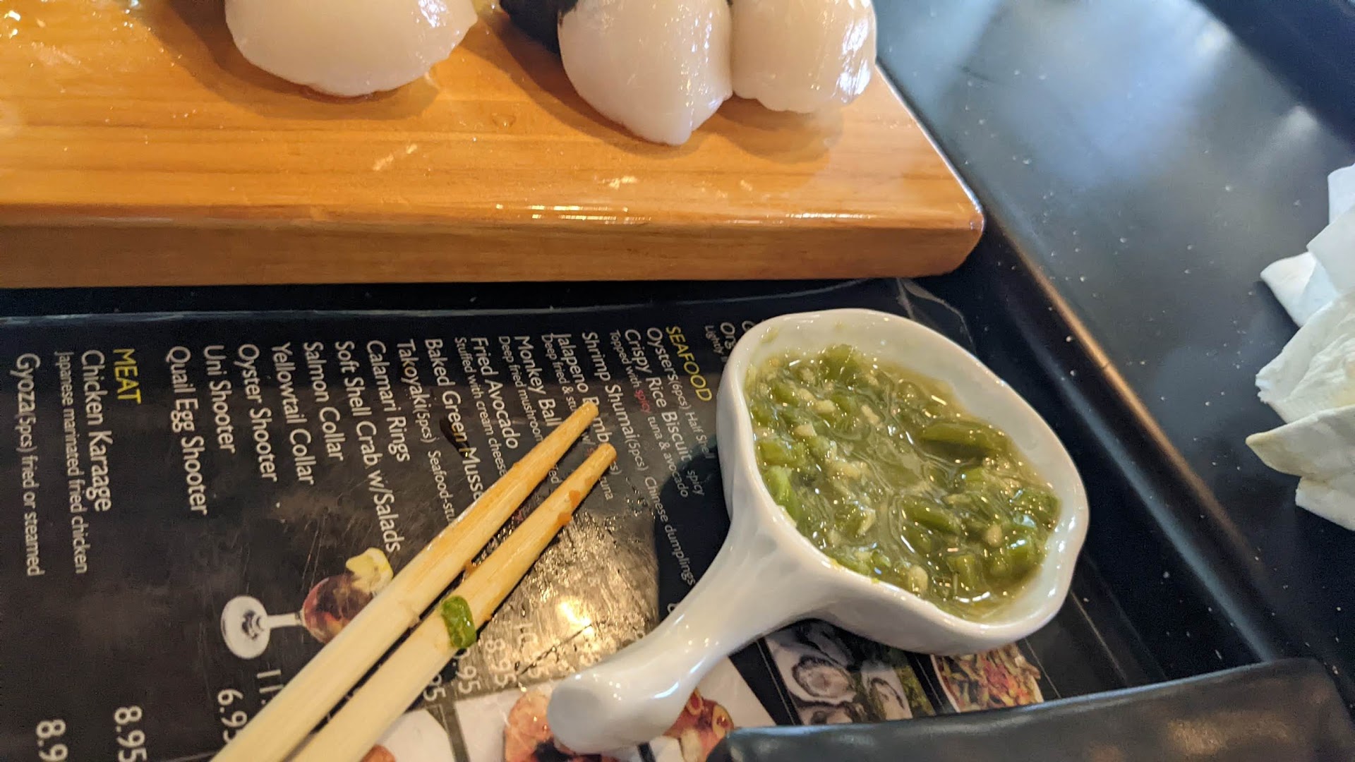 On the positive. Happily surprised with the quality of the fish here. I had the small sashimi platter and rainbow roll. The fried salmon skin hand roll was crispy and delicious. And the quail egg shooter was presented in a champagne glass. My friends had a few rolls and scallop nigiri and it was like butter melting in your mouth it was so good. They brought us a truffle sauce and Japanese sauce which were tasty and so glad they let us try it. We were also given REAL wasabi. I've never had it the way they presented it, but it was definitely fresh and had a good kick to it. Will definitely be going back to try more fish!!!