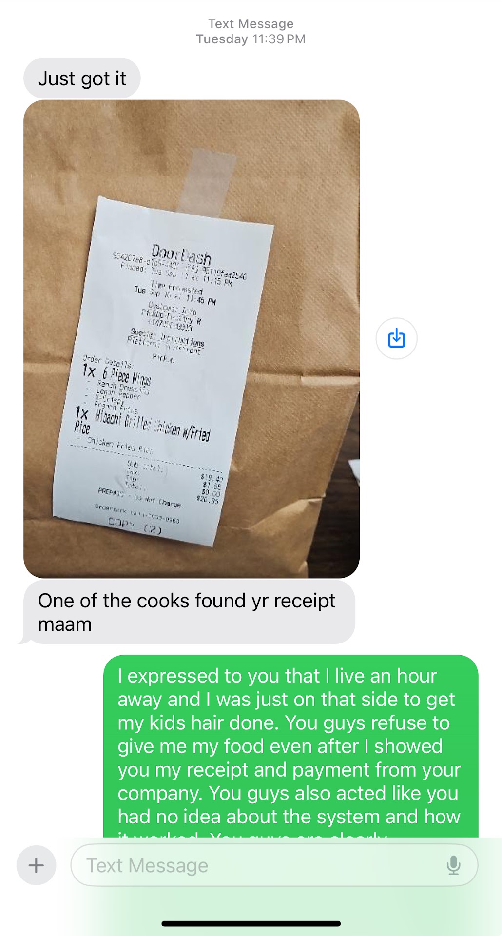 The worse food experience I’ve ever had. I order my food online because that is the only way they allow you to do it if you want to place an order. When you call their number it does not work. Which prompt you to place your order online. I placed my order online. I received an email confirmation and a text confirmation. I actually received two email confirmations. Text tells me what time will be ready. I drive to the place to get my food and they refused to give me my food they say at first they don’t do DoorDash, even though there is a sign when you pull up that says that way for DoorDash. They then told me and switch the storyby saying they don’t have my receipt so they can’t give me my food because they don’t see the order. I am showing them my receipt that they text me and emailed me, but they still refused me. I had my kid with me in the car and that’s who I came to get food for. No matter how many times I show them my receipt that they emailed me. They refused to give me my food because they said they lost my receipt. About 30 minutes after leaving they didn’t text me and say oh we found your receipt, you can come get your food. I already drove an hour. Why would I come and drive back to get food that they refuse to give me after telling me I never ordered. It was a horrible experience. How do you refuse something someone paid for because they don’t have their stuff together with their busines. Look at the picture of the text telling me to come back for my food after refusing to give it to me with multiple proof that i ordered. Oh and get this at first they tried to act like they were making my food and then suddenly oh we can’t...