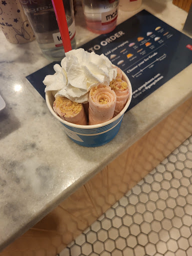 The rolled ice cream itself was just okay for my taste. Interestingly, I found it more enjoyable as it began to melt, revealing its flavors more fully as it transitioned towards the texture of traditional ice cream. Although I'm glad to have satisfied my curiosity and experienced rolled ice cream, I think I'll stick to my usual ice cream preferences in the future. It was a worthwhile visit, but traditional ice cream still...