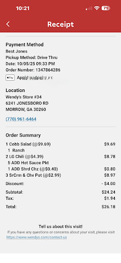 Read moreThis is probably the worst Wendy's I've ever attended. It's not the food that is bad. It's the typical Wendy's flavor, which I've always loved. It's the service and reliability. Everytime I go to this Wendy's in the evening, they claim that their credit card machine is down and they're only accepting exact change in cash. However, if you go during the day their credit card machine works. It just seems like they don't want to serve the majority of individuals that have credit cards. It's honestly a bummer. Not only do they not accept credit cards in the evening, but they have bad attitudes and treat customers like an inconvenience in the evening. Additionally, they have a system in the DT that they make you wait at the pay window until someone calls you to the pick up window, then you can drive to pick up your food. As a result, they're extremely slow cause they're making cars wait at the pay window until food is ready, then you can move to the pick up window. Talk about cheating their drive thru wait times. So, they don't want to take credit cards in the evening, they're rude, AND they move slow cause they're trying to hit a certain time on their DT timer in an extremely inefficient way. Honestly,they suck. They can be better if they try but this is what they're choosing. I hope the manager of this location can coach their employees in the evening, unless this is a direct result of the manager then I hope corporate fixes this cause it will impact their business in a location that local business growth is crucial to help propel the...
