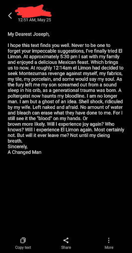 I hope this text finds you well. Never to be one to forget your impeccable suggestions, I've finally tried El Limon. At approximately 5:30 pm I sat with my family and enjoyed a delicious Mexican feast. Which brings us to now. At roughly 12:14am el Limon had decided to seek Montezumas revenge against myself, my fabrics, my tile, my porcelain, and some would say my soul. As the fury left me my son screamed out from a sound sleep in his crib, as a generational trauma was born. A poltergeist now haunts my bloodline. I am no longer man. I am but a ghost of an idea. Shell shock, ridiculed by my wife. Left naked and afraid. No amount of water and bleach can erase what they have done to me. For I still see it the "blood" on my hands. Or brown more likely. Will I experience joy again? Who knows? Will I experience El Limon again. Most certainly not. But will it ever leave me? Not until my dieing...