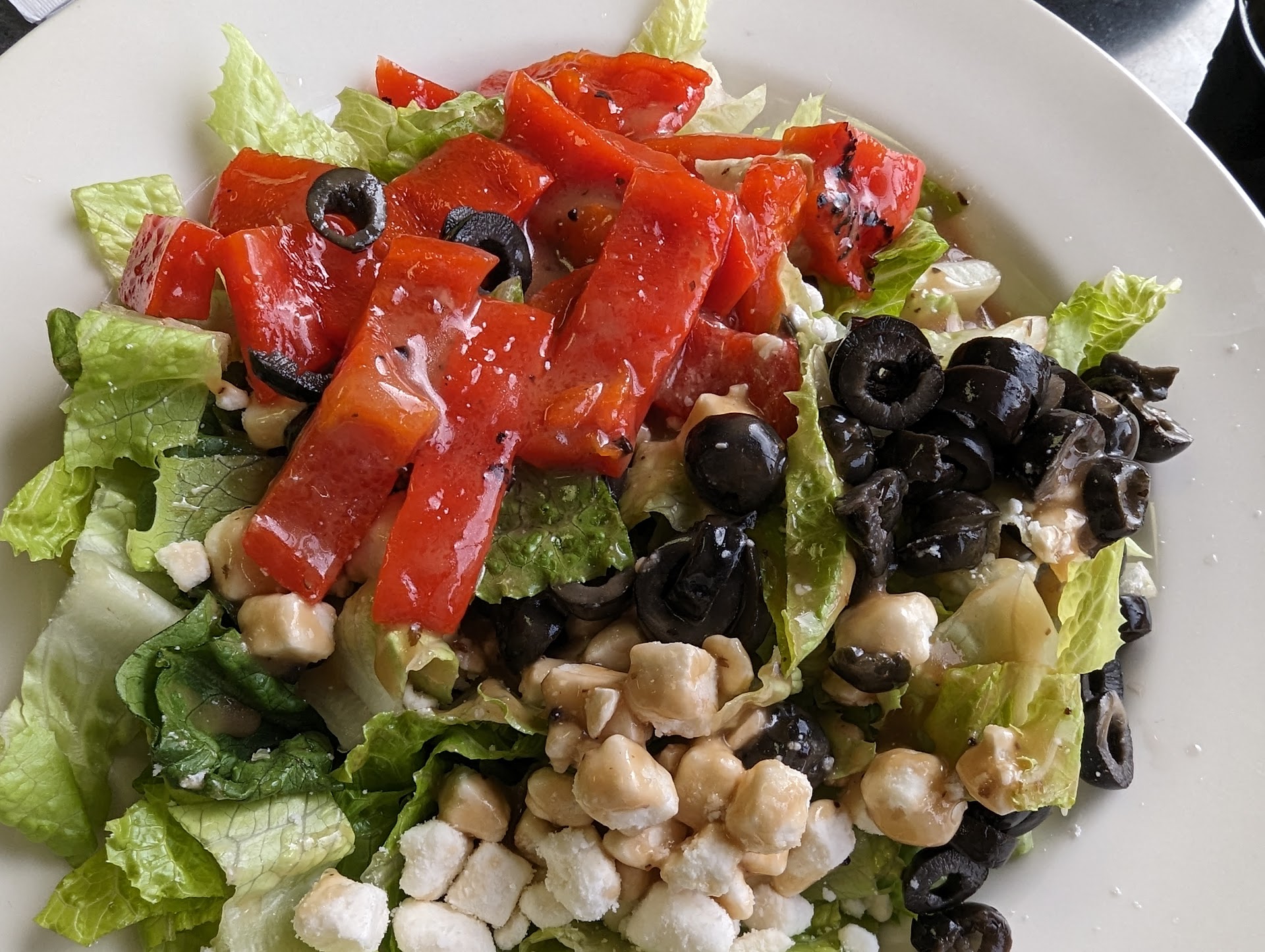 I was anticipating that there would be onions, kalamata olives, lots of fresh feta cheese and so on. However, what I received was pretty disappointing. See the photo, but in short I'll tell you the red stuff was what seemed to be bottled peppers and the feta cheese was very powdery and not at all tasty. The salad dressing was pretty nondescript, tasting kind of like oil and vinegar. The olives were the black variety and there were chickpeas. I guess for a small town this is what I should have expected, but it just wasn't what I would consider a good tasting salad. The other salad in the photo was a taco salad. I can't vouch for how it tasted, but it sure was pretty.