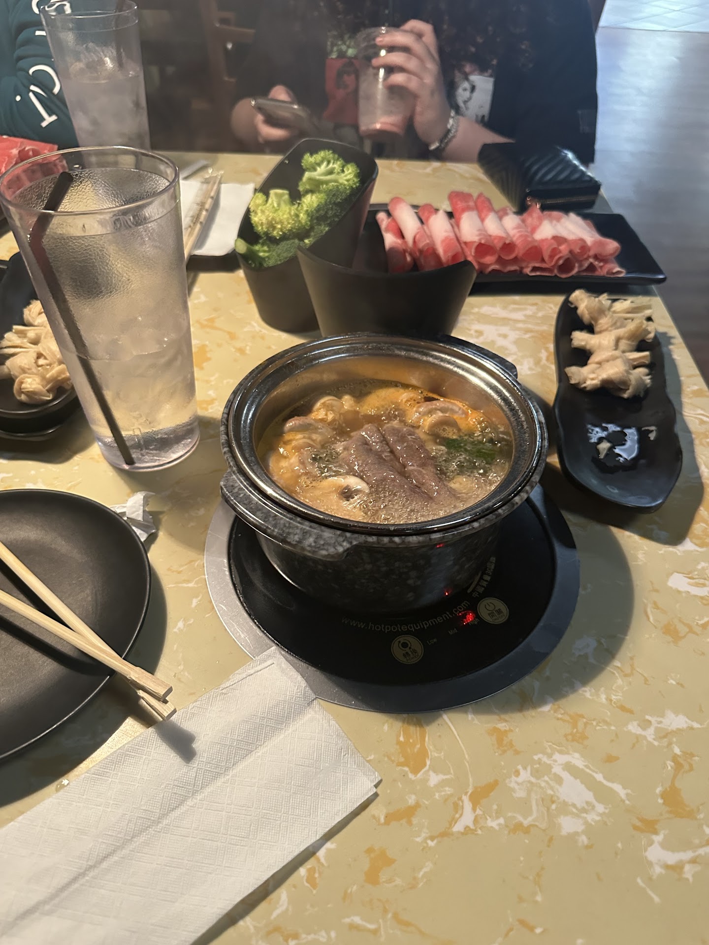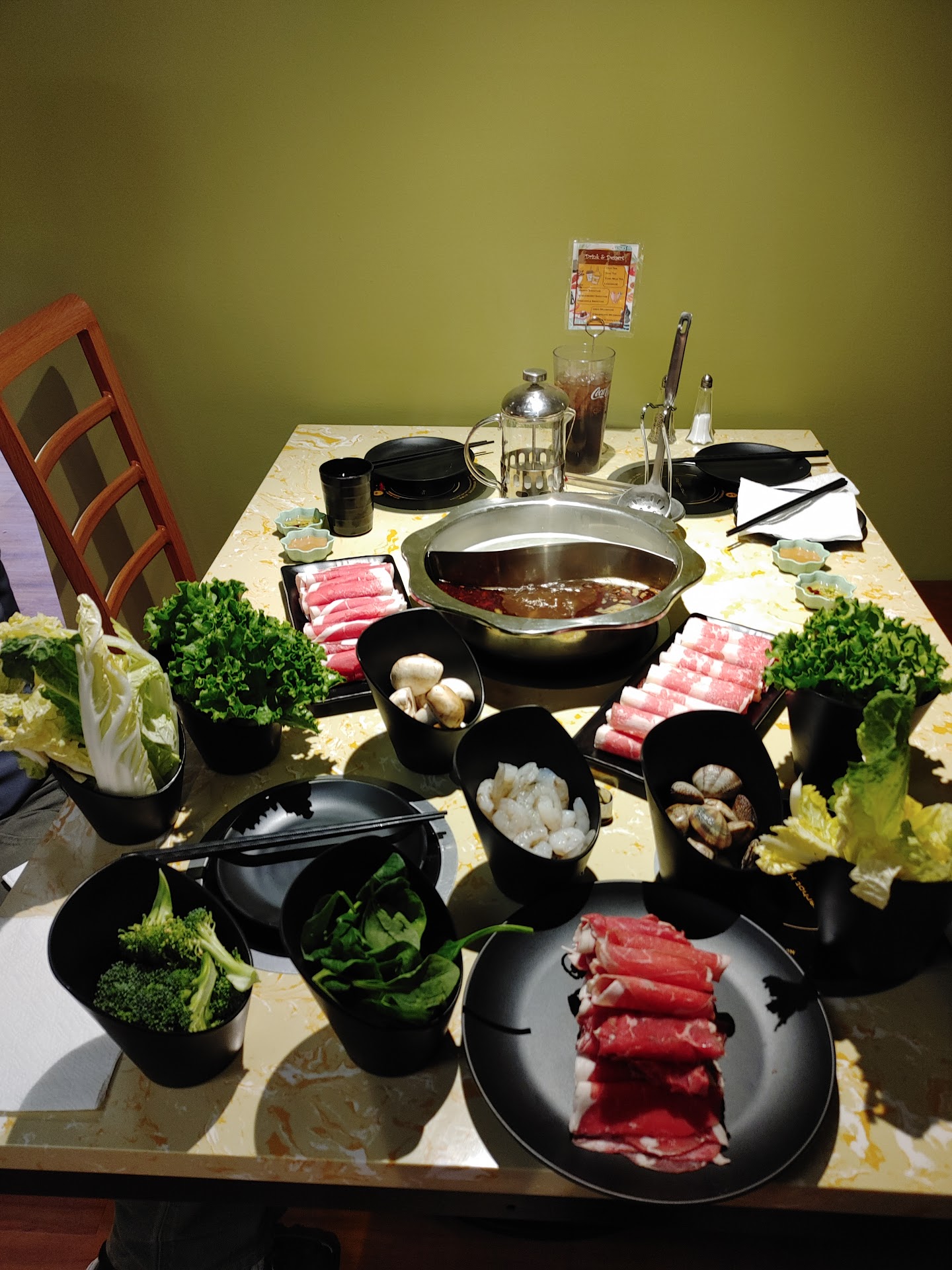 Read moreGirlfriend and I came here for lunch to try it out for the first time. we got there as soon as they opened on a wed. There was only 3 tables being occupied including us. The food quality was great, veggies were very fresh, beef was tender. Broth was a little lacking we got the split of spicy/ tomato broths. The spicy was not spicy at all, tip order the dry chili powder and add it to the broth it definitely helped, the tomato broth was okay, had flavor but still a little weak. The atmosphere was calming and nice, everything was clean and ready. The staff was friendly and attentive. They owner/manager definitely needs to switch to a 3 person open staff 1 cook 1 waiter is not enough we waited quite awhile for things to be brought out which unfortunately had us rushing to finish as we only had an hour and half to spare. Aside from all of that the portions are decent the only major issue I had was the pricing Dear God they are expensive for 2 people who got a split broth, 3 sauces, 2 protein, and 3 veg it came to almost $50... it's a nice place, just be ready to spend a good amount of money if there are more...