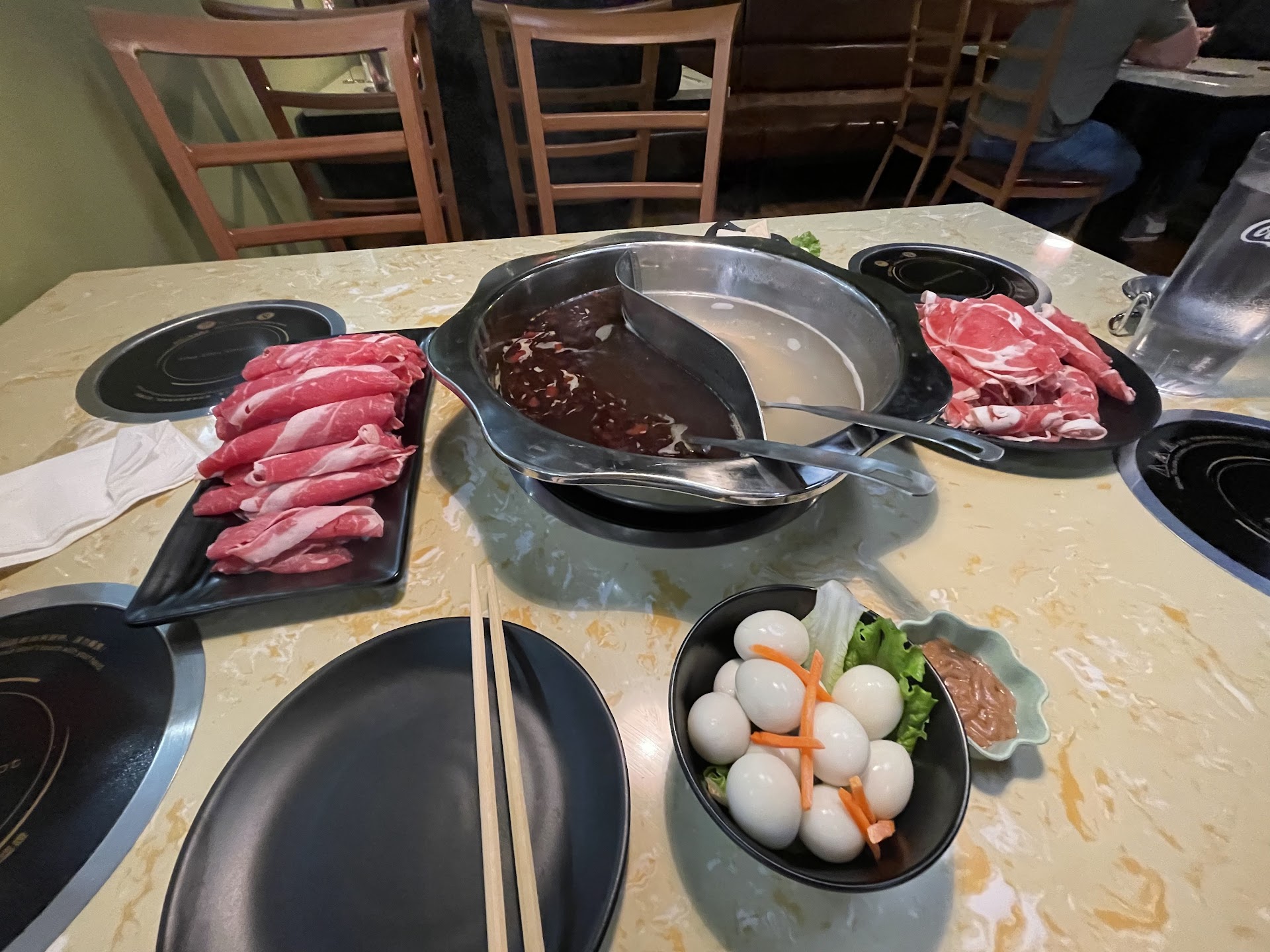 Read moreThis was our first time trying a hot pot so I don't know how it compares. We were seated quickly, the way you order was explained well, and the food came out very quickly. The bill was $45 for a two-broth hot pot, marbled beef slices, broccoli, baby bamboo, daikon, mushrooms, fresh noodles, chili flakes, garlic oil, a mango smoothie, and custard buns. The spicy broth was moderately spicy and tasted slightly like anise seed among other spices (I'm not a fan of black licorice tasting spices but I understand it's common in Asian foods). The mushroom broth hardly had any flavor at all. We were passing the garlic oil back and forth to make it a little less bland. The mango smoothie was alright and the custard buns were a fun texture and smelled amazing but tasted kind of bland. At the end of the day we left still moderately hungry. It was a fun experience and the service was great but the food was pretty bland and we...