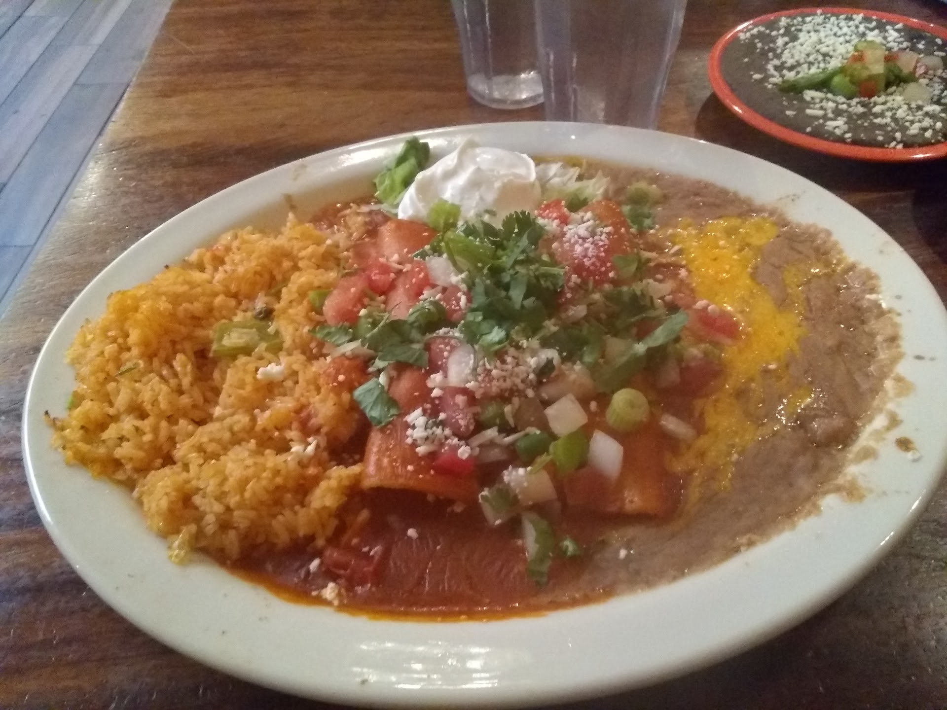 Needing improvement: Spinach in enchiladas, very overcooked. Chicken was partially raw.