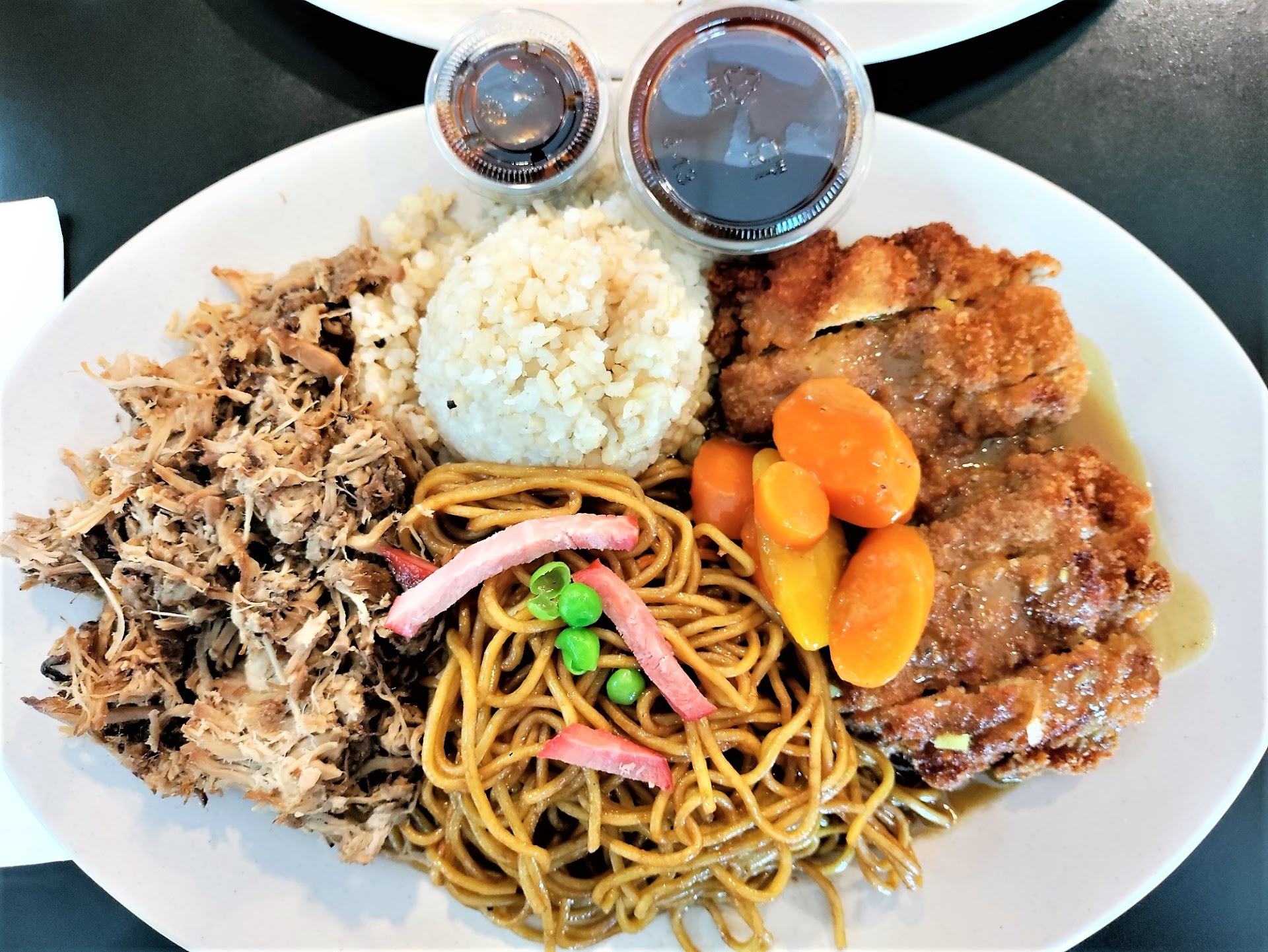 We had Katsu Curry (panko breaded chicken with green curry), BBQ Certified Angus Beef, Spicy (island style teriyaki), Shrimp (coconut battered shrimp with Thai peanut sauce), and Pulled Pork (smoked). For sides we got the Noodles and Brown Rice.